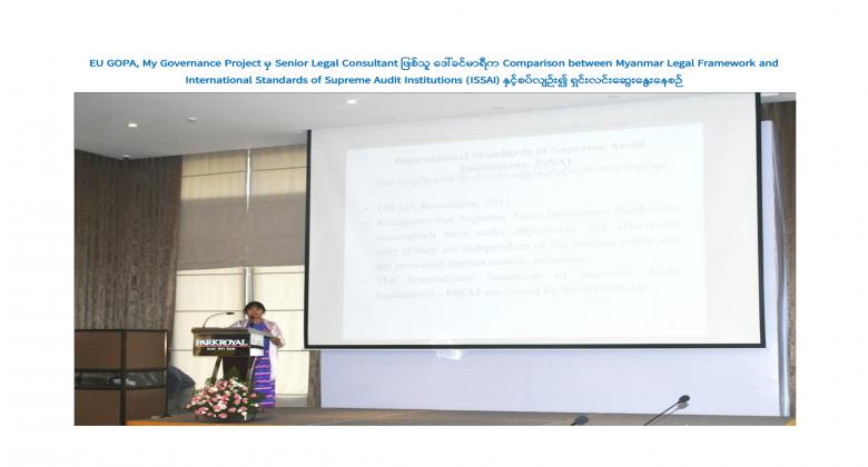 ပြည်ထောင်စုစာရင်းစစ်ချုပ်ဉီးမော်သန်းနှင့် တာဝန်ရှိသူများသည် ၂၀၁၉ ခုနှစ်၊ မေလ ၂၅ ရက်နေ့၊ နံနက် ၈:၃၀ နာရီတွင် နေပြည်တော်၊ Park Royal Hotel ၌ EU GOPA ၏ My Governance Project မှ ကြီးမှူးကျင်းပသည့် Legal Framework of the Office of Auditor General of the Union in line with INTOSAI Standards and Practices ဆွေးနွေးပွဲနှင့် နေ့လယ်စာစားပွဲသို့ တက်ရောက်ခဲ့ပါသည်။ ဆွေးနွေးပွဲမှာ ပြည်ထောင်စုစာရင်းစစ်ချုပ်ရုံးနှင့်သက်ဆိုင်သည့် ဥပဒေမူဘောင်ကို နိုင်ငံတကာစာရင်း စစ်ချုပ်ရုံးများအဖွဲ့ (INTOSAI) ၏ စံများနှင့်အညီဖြစ်အောင်ပြင်ဆင်၍ လက်တွေ့ဆောင်ရွက်နေမှုများကို ဥပဒေမူဘောင်နှင့်အညီ ဆောင်ရွက်နိုင်ရန် ကျင်းပခြင်းဖြစ်ပါသည်။