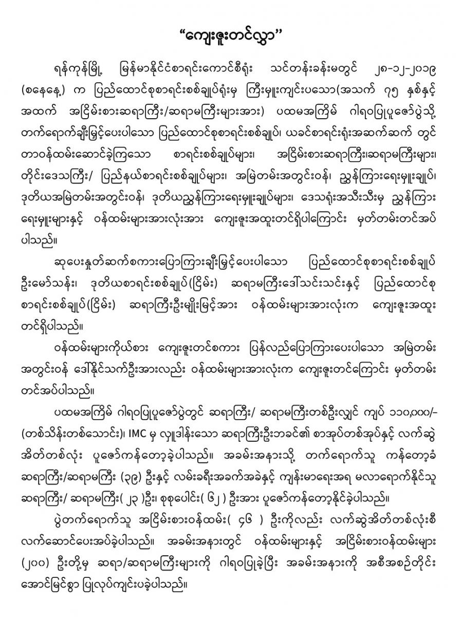 ပြည်ထောင်စုစာရင်းစစ်ချူပ်ရုံးမှ ကြီးမှူးကျင်းပသော ပထမအကြိမ် သက်ကြီးပူဇော်ပွဲ အခမ်းအနား