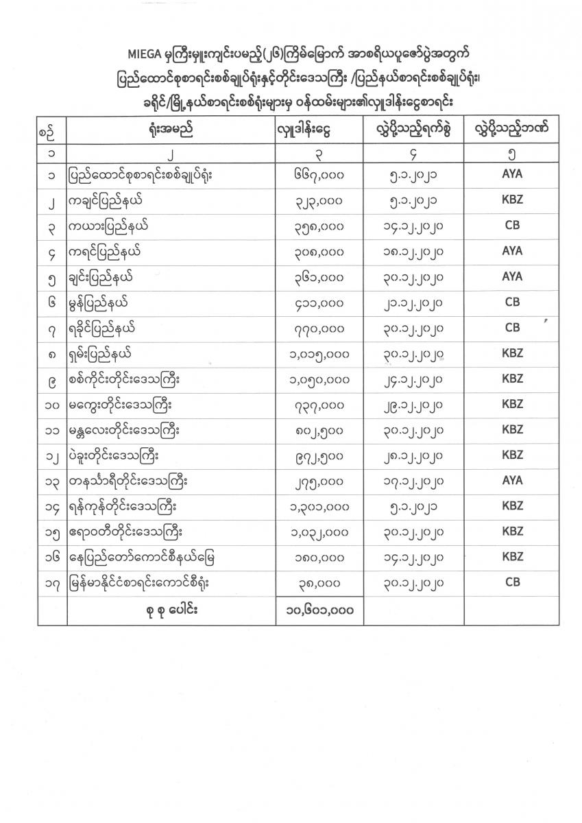MIEGA မှ ကြီးမှူးကျင်းပမည့် (၂၆) ကြိမ်မြောက် အာစရိယပူဇော်ပွဲအတွက် ပြည်ထောင်စုစာရင်းစစ်ချုပ်ရုံးနှင့်တိုင်းဒေသကြီး/ ပြည်နယ်စာရင်းစစ်ချုပ်ရုံး၊ ခရိုင်၊ မြို့နယ်စာရင်းစစ်ရုံးများမှ ဝန်ထမ်းများ၏ လှူဒါန်းငွေစာရင်း