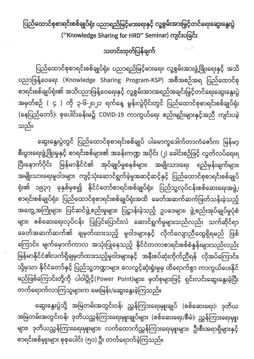 ၃-၆-၂၀၂၁ ရက်နေ့တွင် ပြည်ထောင်စုစာရင်းစစ်ချုပ်ရုံး ပညာရည်မြင့်မားရေးနှင့် လူ့စွမ်းအားမြှင့်တင်ရေးဆွေးနွေးပွဲ (‘‘Knowledge Sharing for HRD’’ Seminar) ကျင်းပခြင်း