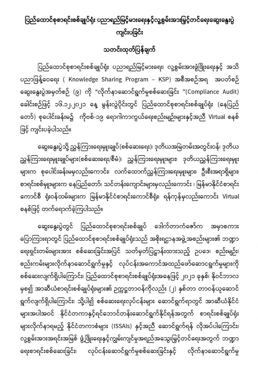 ၁၆-၁၂-၂၀၂၁ ရက်နေ့တွင် ပြည်ထောင်စုစာရင်းစစ်ချုပ်ရုံး ပညာရည်မြင့်မားရေးနှင့်လူ့စွမ်းအားမြှင့်တင်ရေးဆွေးနွေးပွဲ ကျင်းပခြင်း