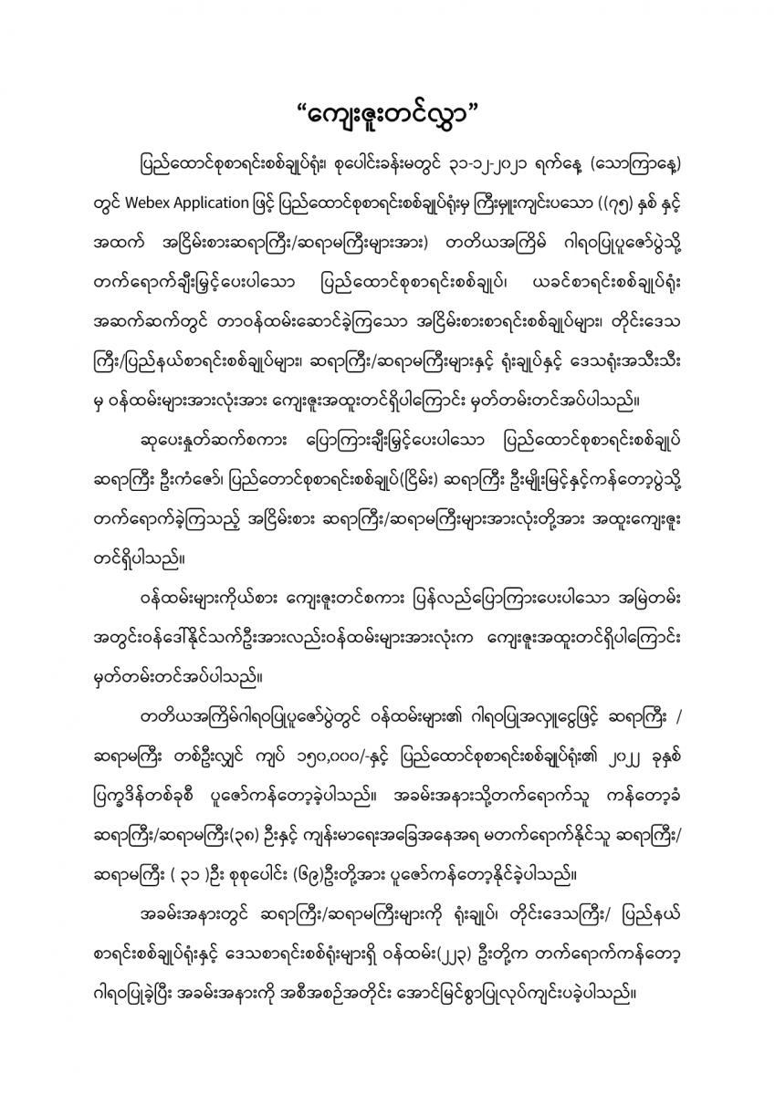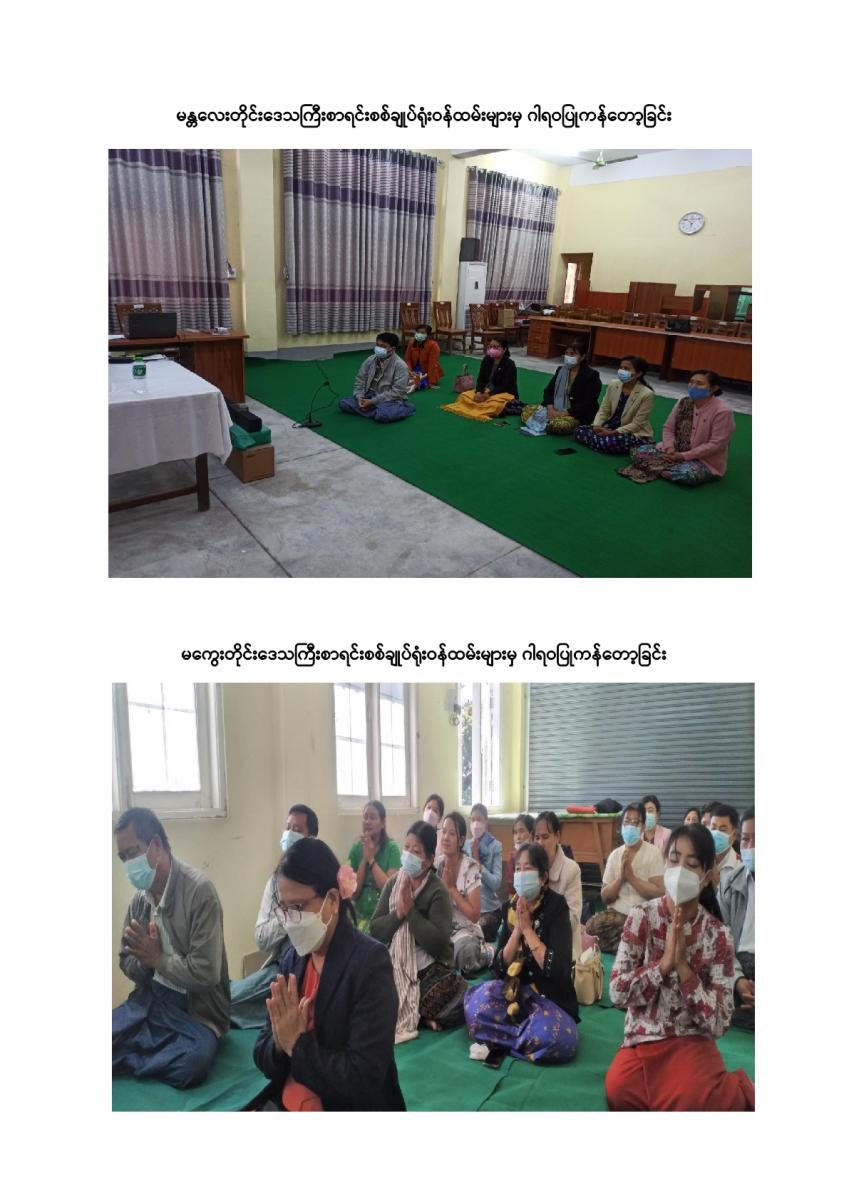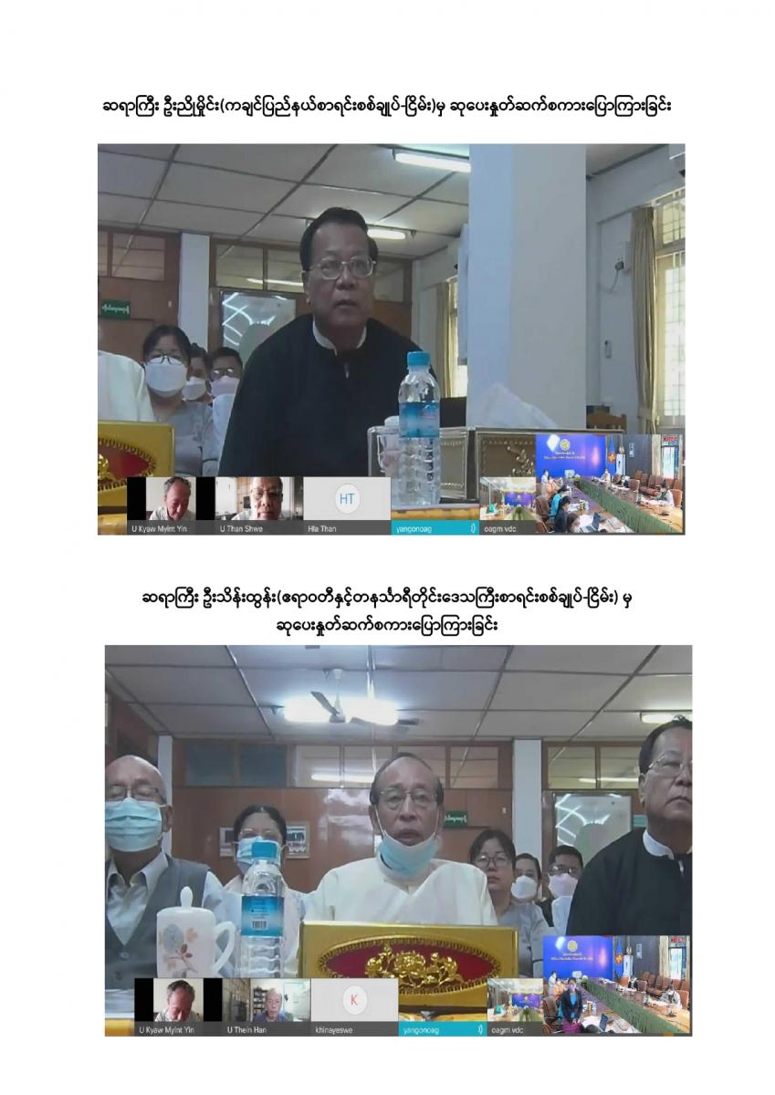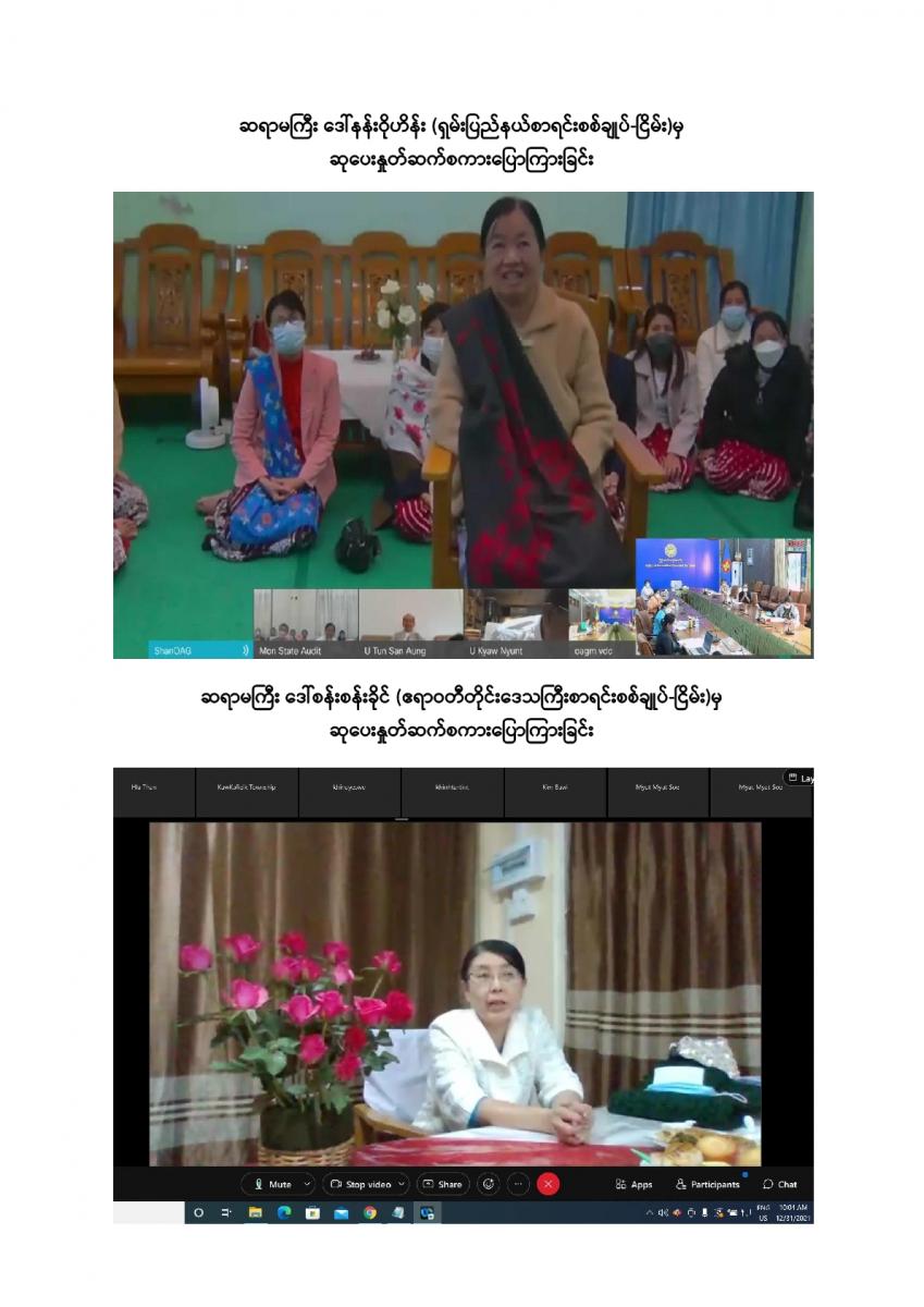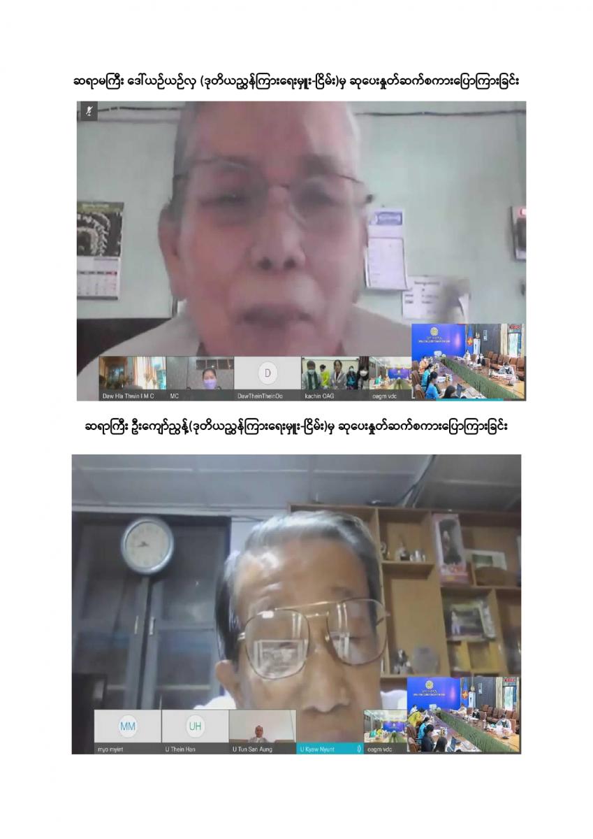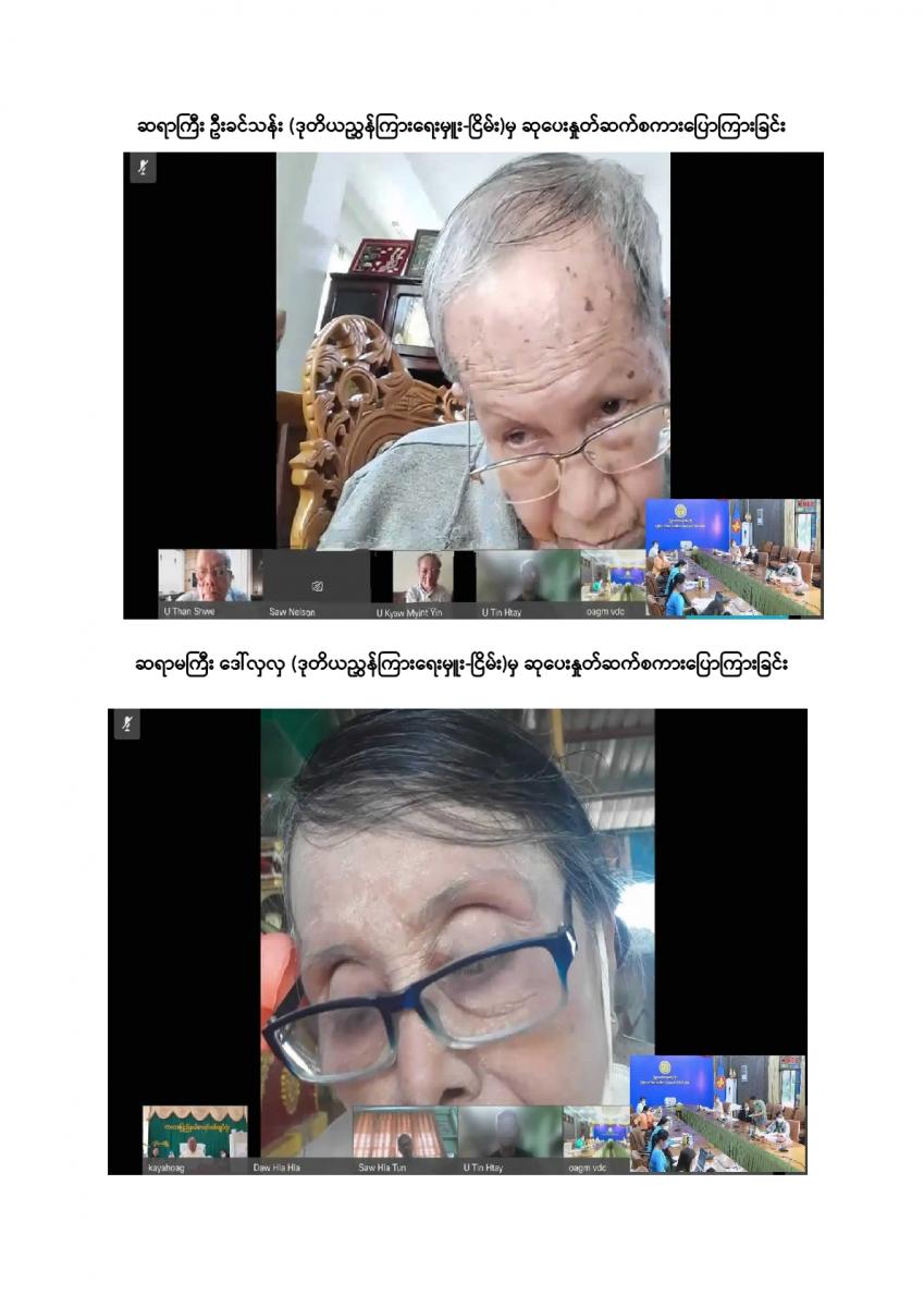 ပြည်ထောင်စုစာရင်းစစ်ချုပ်ရုံးမှ ကြီးမှူးကျင်းပသော တာဝန်ထမ်းဆောင်ဆဲနှင့် အငြိမ်းစား ပြည်ထောင်စုစာရင်းစစ်ချုပ်များ၊ ဒုတိယစာရင်းစစ်ချုပ်နှင့် တာဝန်ထမ်းဆောင်ခဲ့ကြသည့် တိုင်းဒေသကြီး/ ပြည်နယ်စာရင်းစစ်ချုပ်များ၊ ယခင်စာရင်းစစ်ရုံးအဆက်ဆက်တွင် တာဝန်ထမ်းဆောင်ခဲ့ကြသည့် ရုံးအကြီးအကဲများ၊ အသက် (၇၅) နှစ်နှင့်အထက်(ဒုတိယညွှန်ကြားရေးမှူးနှင့်အထက်) သက်ကြီးဝါကြီးဆရာသမားများအား ပူဇော်ကန်တော့သည့်အခမ်းအနားကို ၃၁-၁၂-၂၀၂၁ ရက်နေ့ နံနက် (၉:၀၀ နာရီ) တွင် ပြည်ထောင်စုစာရင်းစစ်ချုပ်ရုံး၊ အစည်းအဝေးခန်းမ၌ Virtual System ဖြင့် ကျင်းပခဲ့သည်။