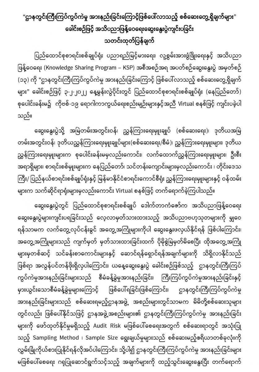 ၃-၂-၂၀၂၂ ရက်နေ့တွင် ဌာနတွင်းကြီးကြပ်ကွပ်ကဲမှု အားနည်းခြင်းကြောင့်ဖြစ်ပေါ်လာသည့် စစ်ဆေးတွေ့ရှိချက်များ ခေါင်းစဉ်ဖြင့် အသိပညာဖြန့်ဝေရေးဆွေးနွေးပွဲကျင်းပခြင်း