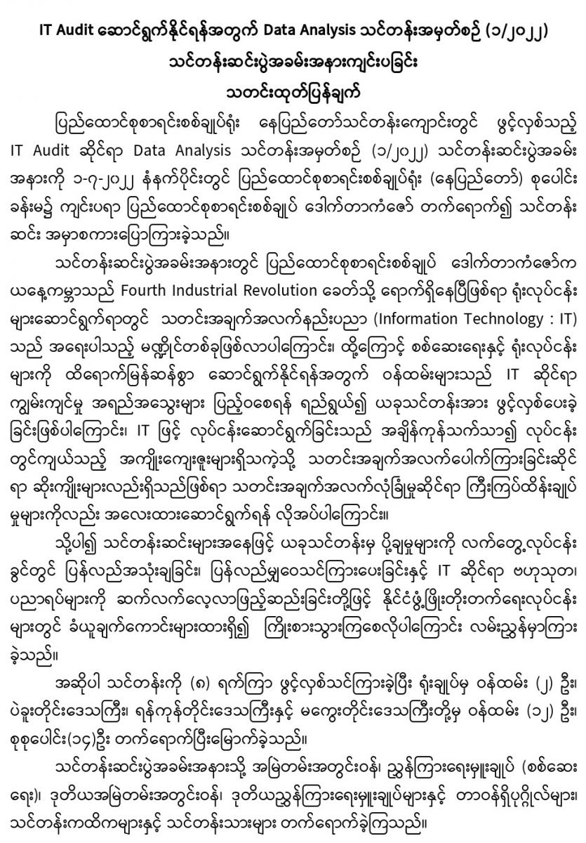 ၁-၇-၂၀၂၂ ရက်နေ့တွင် IT Audit ဆောင်ရွက်နိုင်ရန်အတွက် Data Analysis သင်တန်းအမှတ်စဉ် (၁/၂၀၂၂) သင်တန်းဆင်းပွဲအခမ်းအနားကျင်းပခြင်း