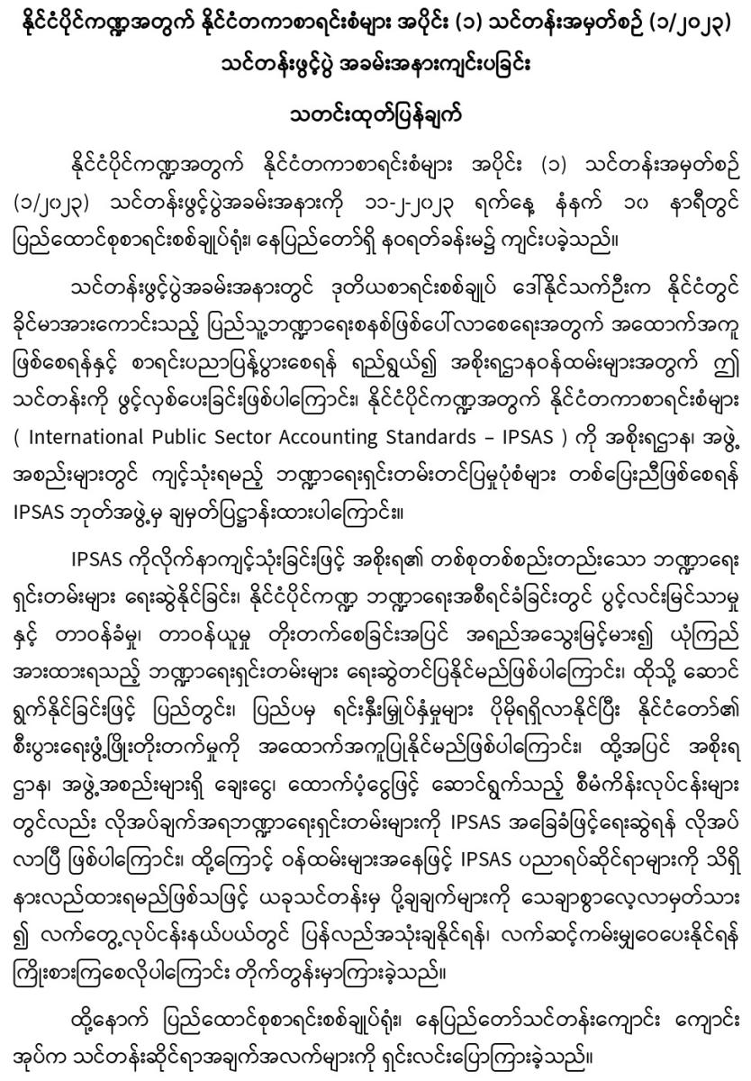 ၁၁-၂-၂၀၂၃ ရက်နေ့တွင် နိုင်ငံပိုင်ကဏ္ဍအတွက် နိုင်ငံတကာစာရင်းစံများ အပိုင်း (၁) သင်တန်းအမှတ်စဉ် (၁/၂၀၂၃) သင်တန်းဖွင့်ပွဲ အခမ်းအနားကျင်းပခြင်း