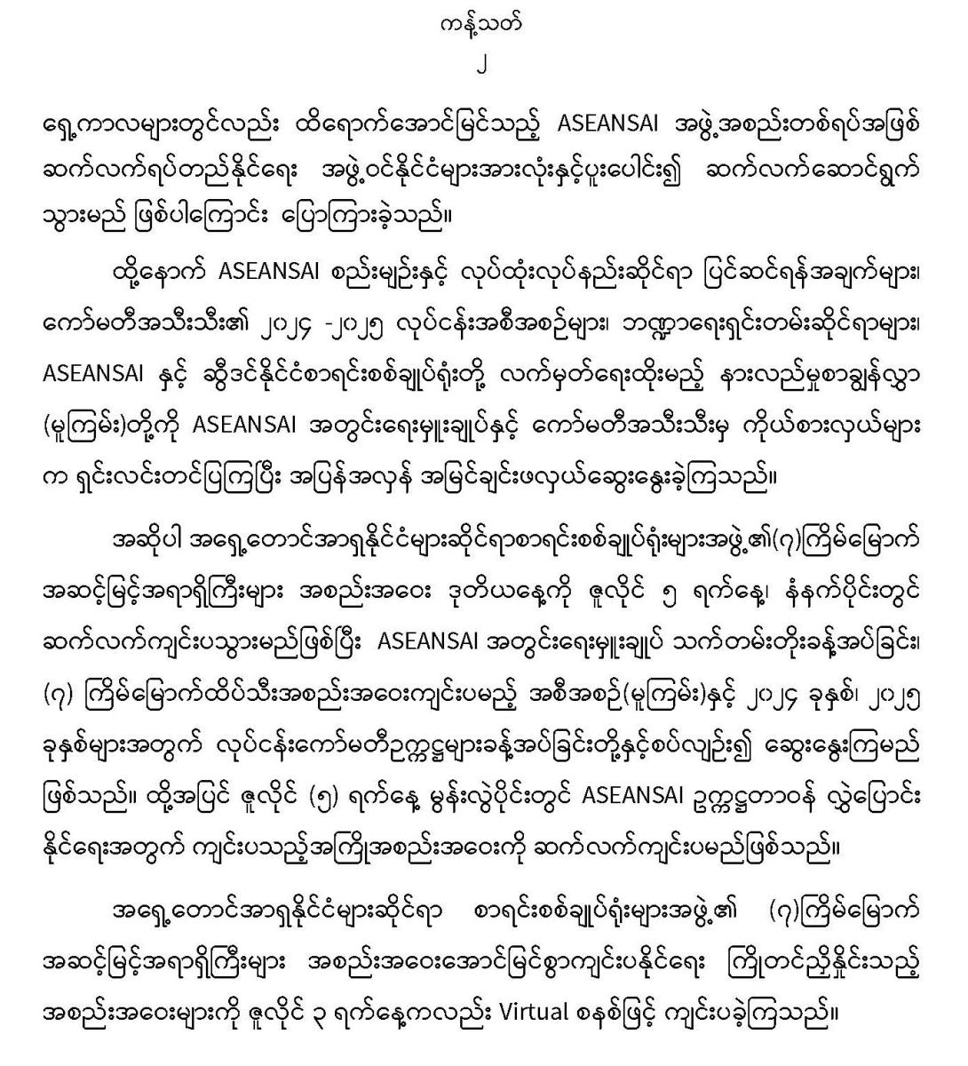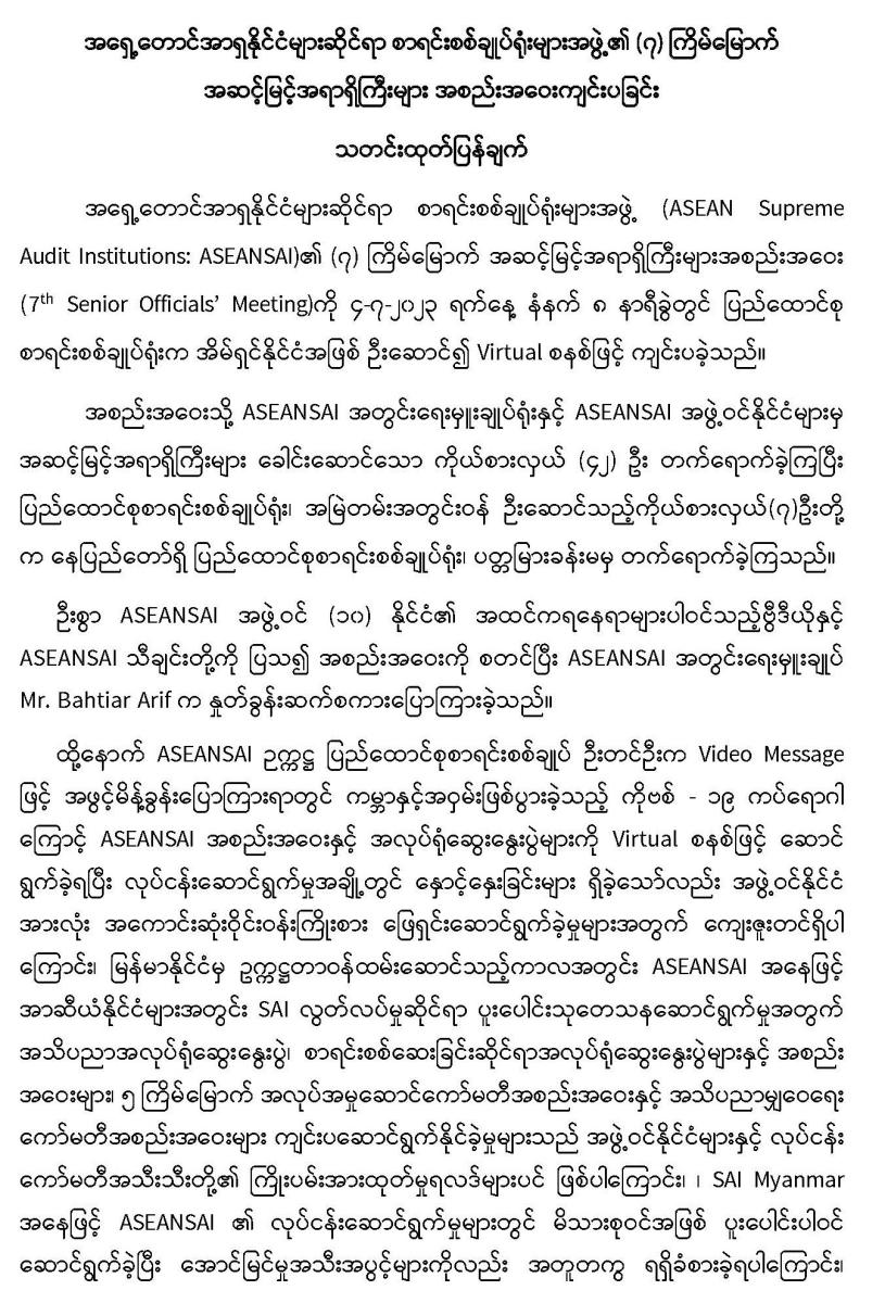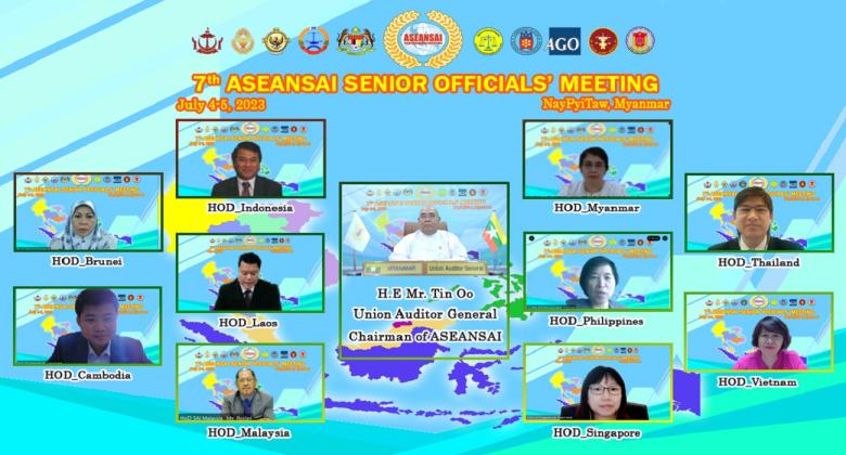 ၄-၇-၂၀၂၃ ရက်နေ့တွင် အရှေ့တောင်အာရှနိုင်ငံများဆိုင်ရာ စာရင်းစစ်ချုပ်ရုံးများအဖွဲ့၏ (၇) ကြိမ်မြောက် အဆင့်မြင့်အရာရှိကြီးများ အစည်းအဝေးကျင်းပခြင်း