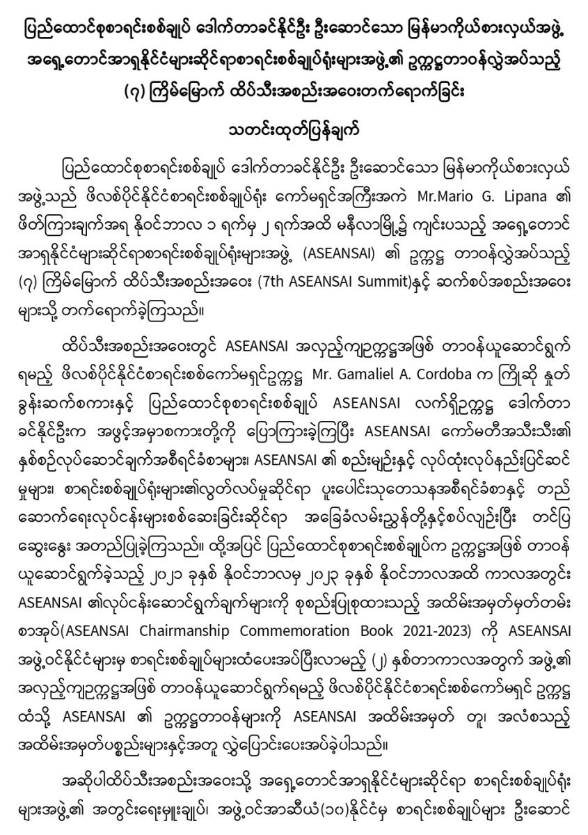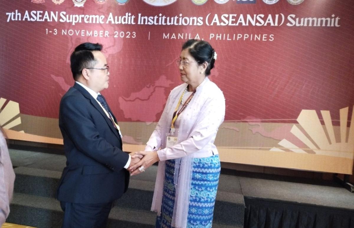 ပြည်ထောင်စုစာရင်းစစ်ချုပ် ဒေါက်တာခင်နိုင်ဦး ဦးဆောင်သော မြန်မာကိုယ်စားလှယ်အဖွဲ့ အရှေ့တောင်အာရှနိုင်ငံများဆိုင်ရာစာရင်းစစ်ချုပ်ရုံးများအဖွဲ့၏ ဥက္ကဋ္ဌတာဝန်လွှဲအပ်သည့် (၇) ကြိမ်မြောက် ထိပ်သီးအစည်းအဝေး တက်ရောက်ခြင်း