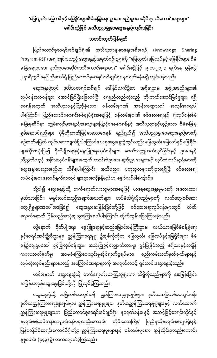 ၉-၁၁-၂၀၂၃ ရက်နေ့တွင် “မြေလွတ်၊ မြေလပ်နှင့် မြေရိုင်းများစီမံခန့်ခွဲရေး ဥပဒေ၊ နည်းဥပဒေဆိုင်ရာ သိကောင်းစရာများ” ခေါင်းစဉ်ဖြင့် အသိပညာမျှဝေဆွေးနွေးပွဲကျင်းပခြင်း
