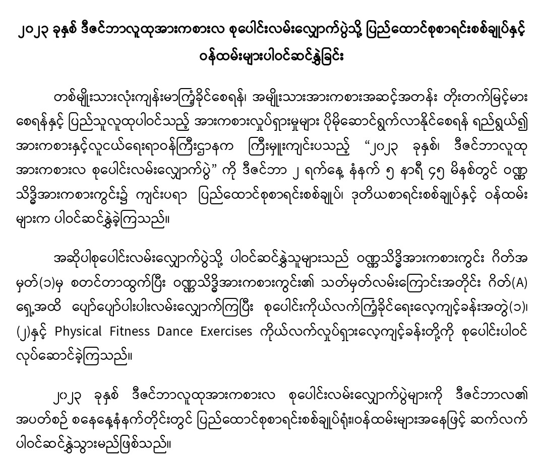 ၂-၁၂-၂၀၂၃ ရက်နေ့တွင် ၂၀၂၃ ခုနှစ် ဒီဇင်ဘာလူထုအားကစားလ စုပေါင်းလမ်းလျှောက်ပွဲသို့ ပြည်ထောင်စုစာရင်းစစ်ချုပ်နှင့် ဝန်ထမ်းများပါဝင်ဆင်နွှဲခြင်း