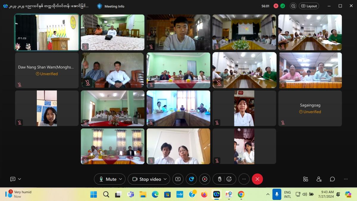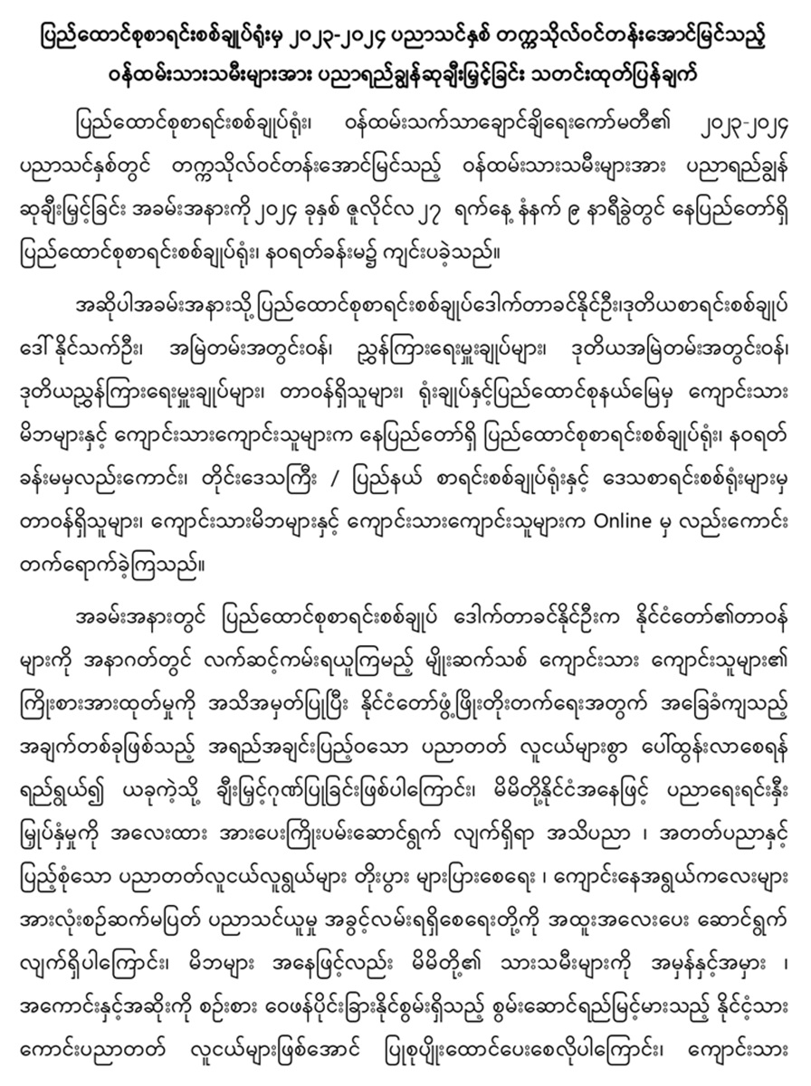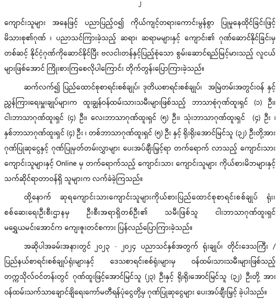 ၂၇-၇-၂၀၂၄ ရက်နေ့ တွင် ကျင်းပသည့် ပြည်ထောင်စုစာရင်းစစ်ချုပ်ရုံးမှ ၂၀၂၃-၂၀၂၄ ပညာသင်နှစ် တက္ကသိုလ်ဝင်တန်းအောင်မြင်သည့် ဝန်ထမ်းသားသမီးများအား ပညာရည်ချွန်ဆုချီးမြှင့်ခြင်း