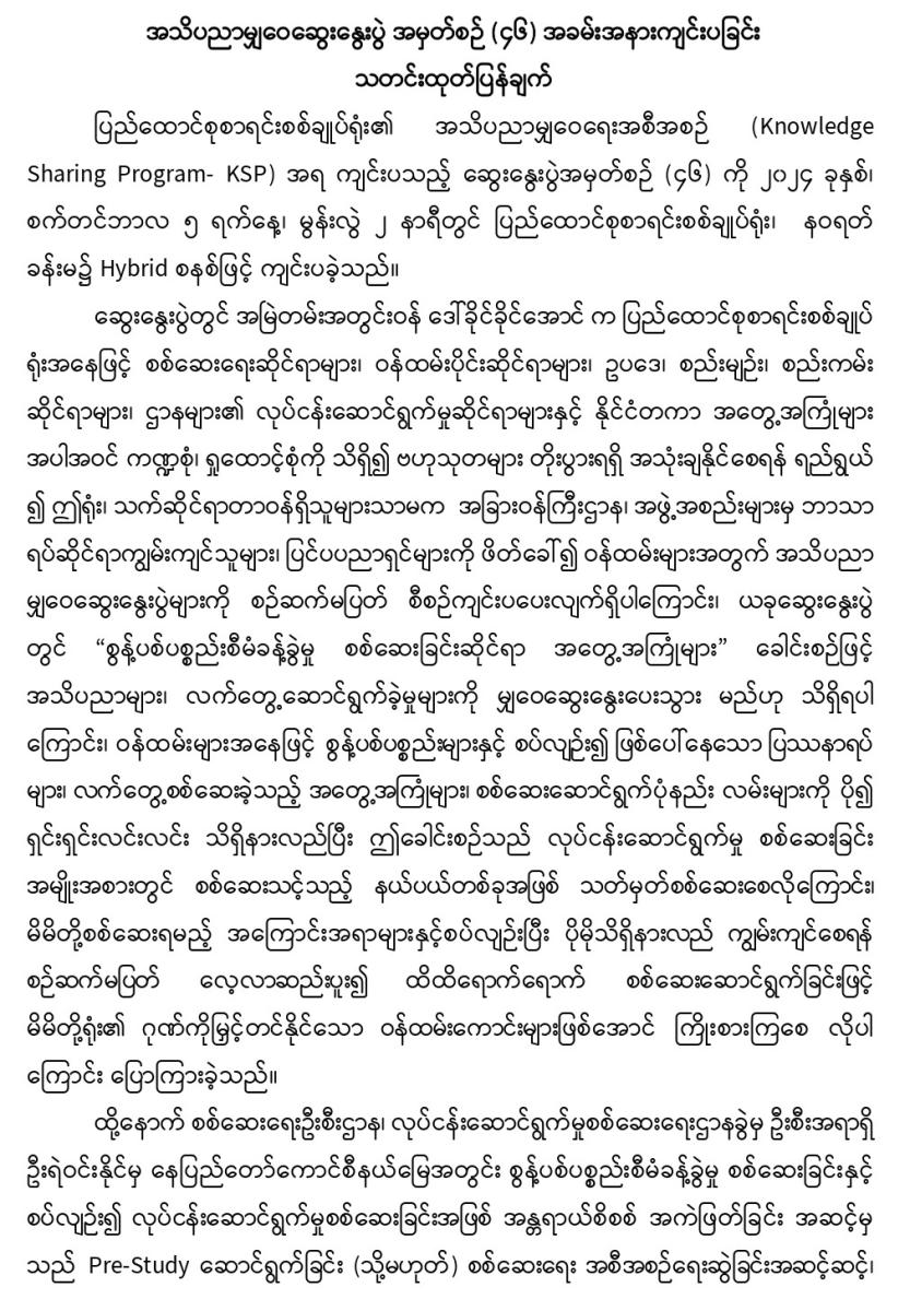 ၅-၉-၂၀၂၄ ရက်နေ့တွင် အသိပညာမျှဝေဆွေးနွေးပွဲ အမှတ်စဉ် (၄၆) အခမ်းအနားကျင်းပခြင်း