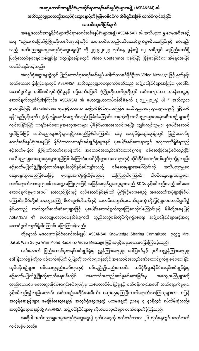 ၂၅-၉-၂၀၂၄ ရက်နေ့နှင့် ၂၆-၉-၂၀၂၄ ရက်နေ့တို့တွင် အရှေ့တောင်အာရှနိုင်ငံများဆိုင်ရာစာရင်းစစ်ချုပ်ရုံးများအဖွဲ့ (ASEANSAI) ၏ အသိပညာမျှဝေသည့်အလုပ်ရုံဆွေးနွေးပွဲကို မြန်မာနိုင်ငံက အိမ်ရှင်အဖြစ် လက်ခံကျင်းပခြင်း