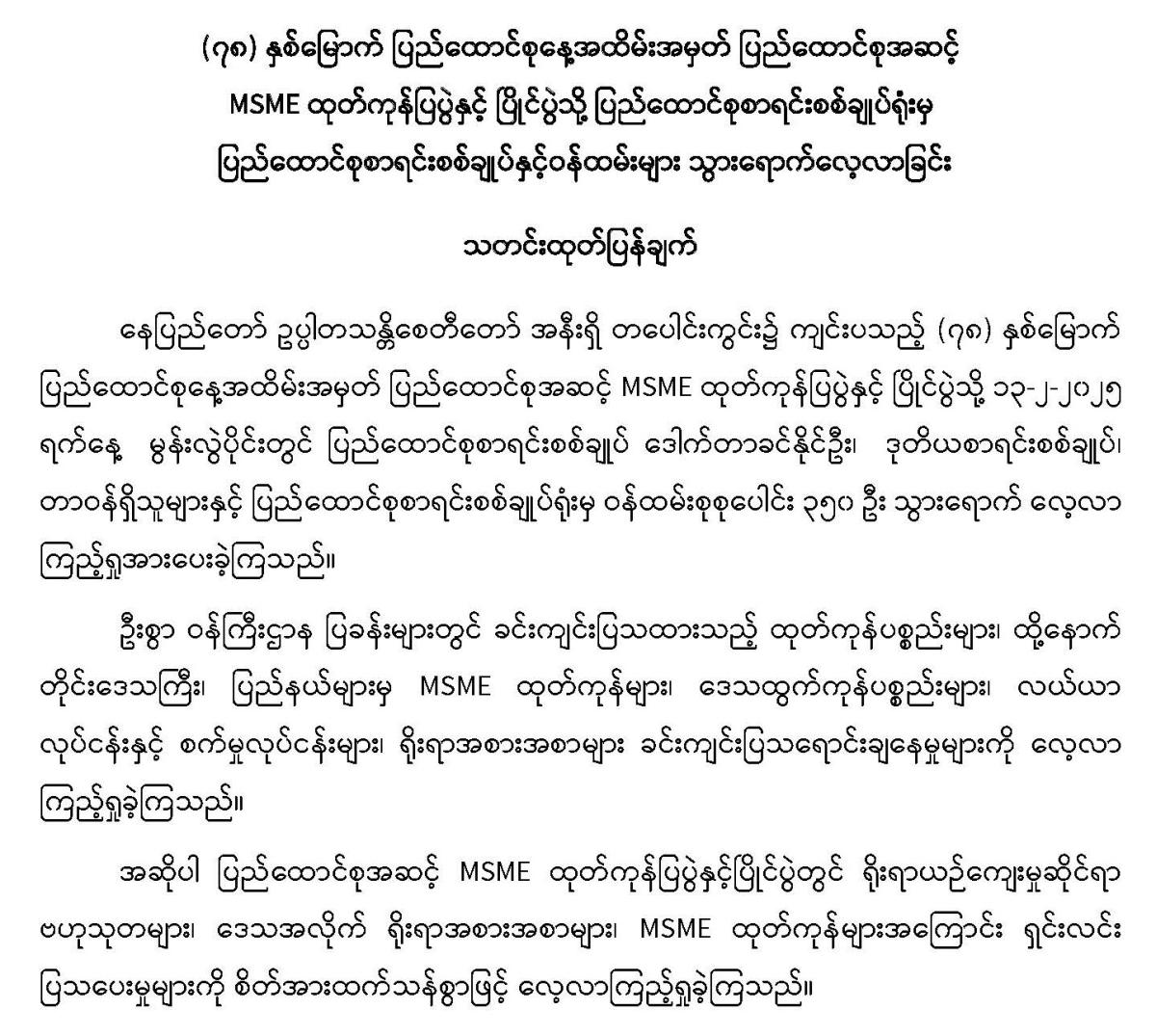 (၇၈) နှစ်မြောက် ပြည်ထောင်စုနေ့အထိမ်းအမှတ် ပြည်ထောင်စုအဆင့် MSME ထုတ်ကုန်ပြပွဲနှင့် ပြိုင်ပွဲသို့ ပြည်ထောင်စုစာရင်းစစ်ချုပ်ရုံးမှ ပြည်ထောင်စုစာရင်းစစ်ချုပ်နှင့်ဝန်ထမ်းများ သွားရောက်လေ့လာခြင်း
