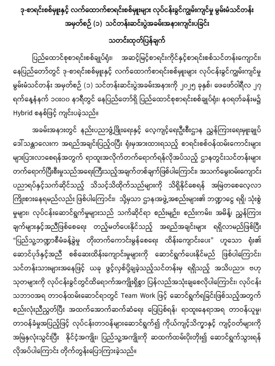 ဒု-စာရင်းစစ်မှူးနှင့် လက်ထောက်စာရင်းစစ်မှူးများ လုပ်ငန်းခွင်ကျွမ်းကျင်မှု မွမ်းမံသင်တန်း အမှတ်စဉ် (၁) သင်တန်းဆင်းပွဲအခမ်းအနားကျင်းပခြင်း