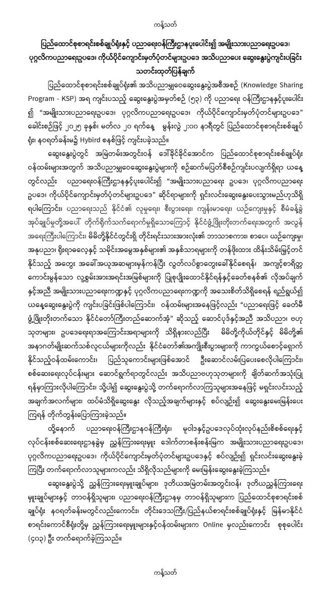 ပြည်ထောင်စုစာရင်းစစ်ချုပ်ရုံးနှင့် ပညာရေးဝန်ကြီးဌာနပူးပေါင်း၍ အမျိုးသားပညာရေးဥပဒေ၊ ပုဂ္ဂလိကပညာရေးဥပဒေ၊ ကိုယ်ပိုင်ကျောင်းမှတ်ပုံတင်များဥပဒေ အသိပညာပေး ဆွေးနွေးပွဲကျင်းပခြင်း