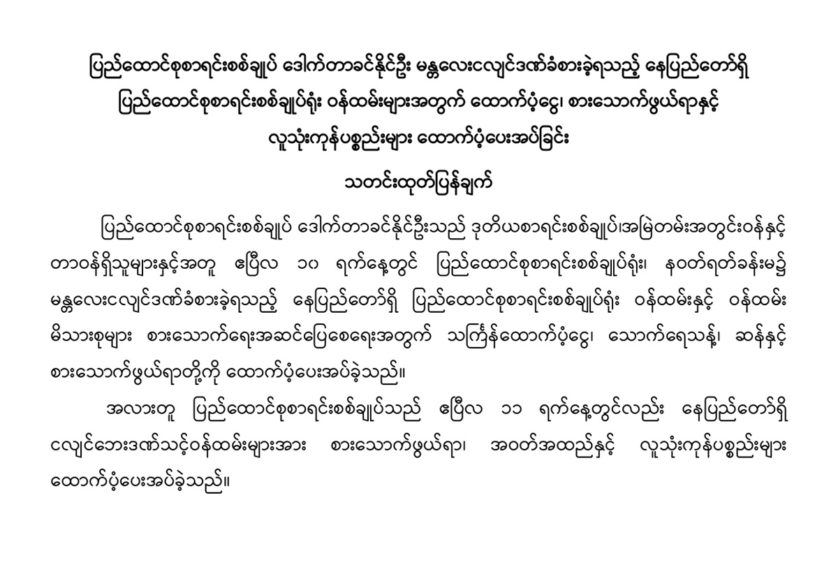 ပြည်ထောင်စုစာရင်းစစ်ချုပ် ဒေါက်တာခင်နိုင်ဦး မန္တလေးငလျင်ဒဏ်ခံစားခဲ့ရသည့် နေပြည်တော်ရှိ ပြည်ထောင်စုစာရင်းစစ်ချုပ်ရုံး ဝန်ထမ်းများအတွက် ထောက်ပံ့ငွေ၊ စားသောက်ဖွယ်ရာနှင့် လူသုံးကုန်ပစ္စည်းများ ထောက်ပံ့ပေးအပ်ခြင်း