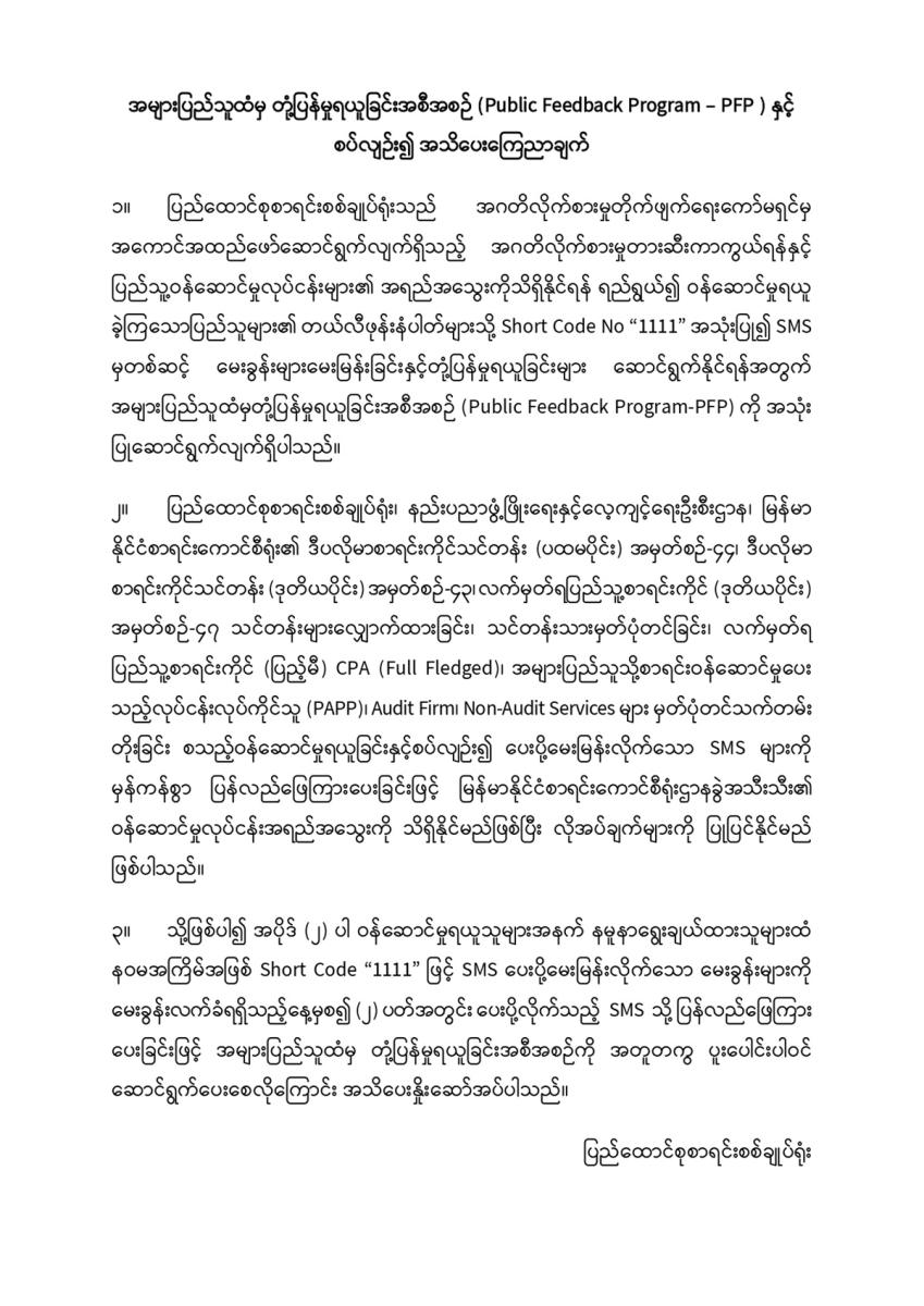 အများပြည်သူထံမှ တုံ့ပြန်မှုရယူခြင်းအစီအစဉ် (Public Feedback Program – PFP ) နှင့် စပ်လျဉ်း၍ အသိပေးကြေညာချက်