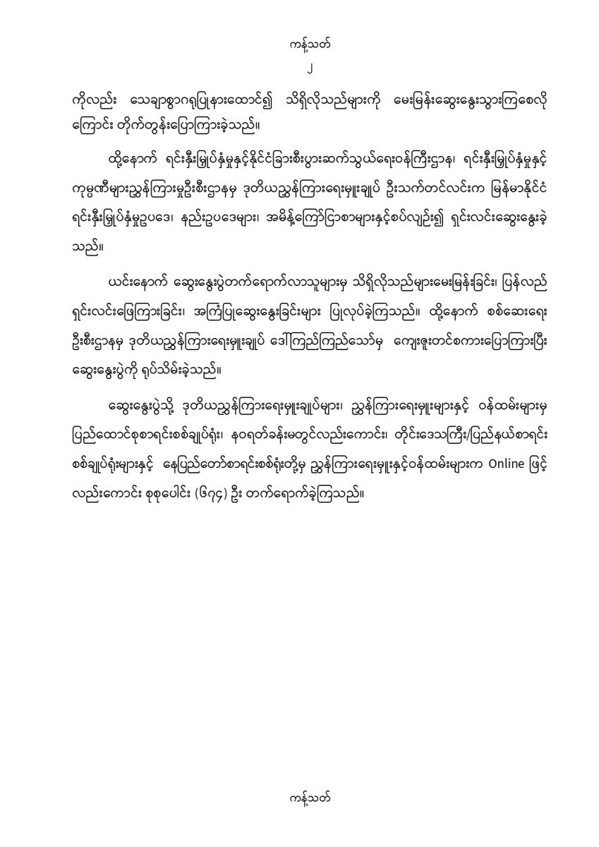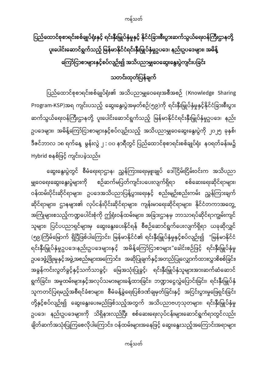 ပြည်ထောင်စုစာရင်းစစ်ချုပ်ရုံးနှင့် ရင်းနှီးမြှုပ်နှံမှုနှင့် နိုင်ငံခြားစီးပွားဆက်သွယ်ရေးဝန်ကြီးဌာနတို့ ပူးပေါင်းဆောင်ရွက်သည့် မြန်မာနိုင်ငံရင်းနှီးမြှုပ်နှံမှုဥပဒေ၊ နည်းဥပဒေများ၊ အမိန့် ကြော်ငြာစာများနှင့်စပ်လျဉ်း၍ အသိပညာမျှဝေဆွေးနွေးပွဲကျင်းပခြင်း