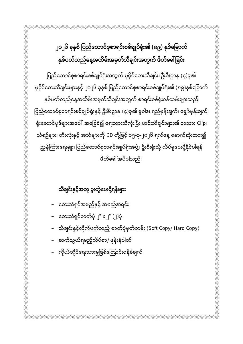 ၂၀၂၆ ခုနှစ် ပြည်ထောင်စုစာရင်းစစ်ချုပ်ရုံး၏ (၈၉) နှစ်မြောက် နှစ်ပတ်လည်နေ့အထိမ်းအမှတ်သီချင်းအတွက် ဖိတ်ခေါ်ခြင်း
