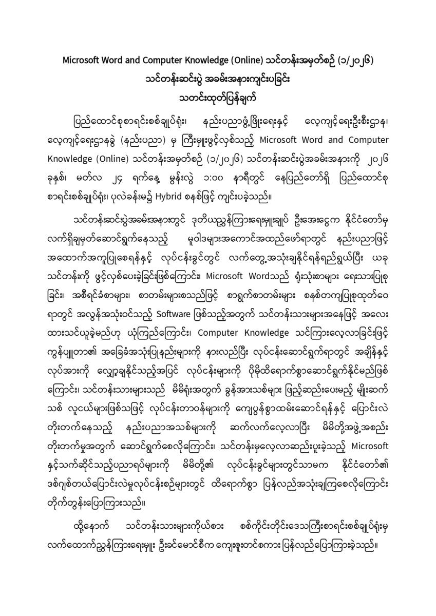 Microsoft Word and Computer Knowledge (Online) သင်တန်းအမှတ်စဉ် (၁/၂၀၂၆) သင်တန်းဆင်းပွဲ အခမ်းအနားကျင်းပခြင်း