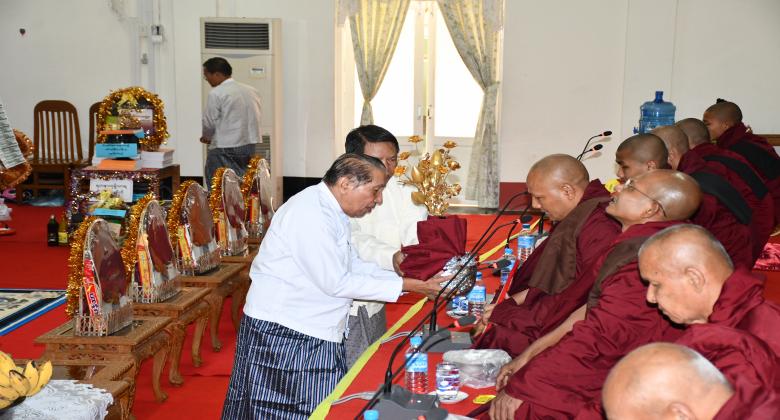 11th Collective Maha Kathina donation ceremony of the Office of the Auditor General of the Union was held at the assembly hall of the Office of the Auditor General of the Union, office building No.12, Nay Pyi Taw at 9:30 a.m on 16 November, 2018. Maha Kathina robe and offertories, kyats 5,494,600 in cash and worth kyats 3,248,230 in kind, totaling amount kyats 8,742,830 were offered to the monks of the Bayargyi and the Yadanar Bhumithara monasteries. Venerable Sayadaws recited the Paritta Suttas, preached a sermon and merits for the donations made were shared.