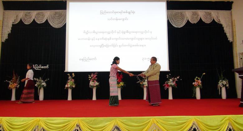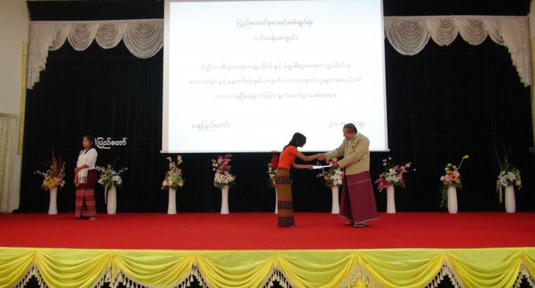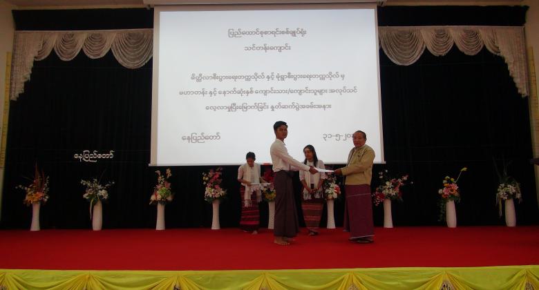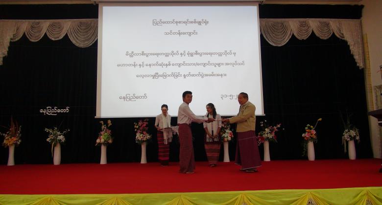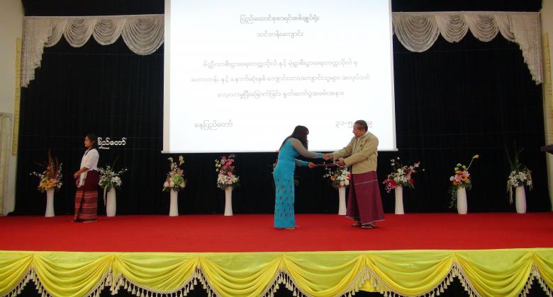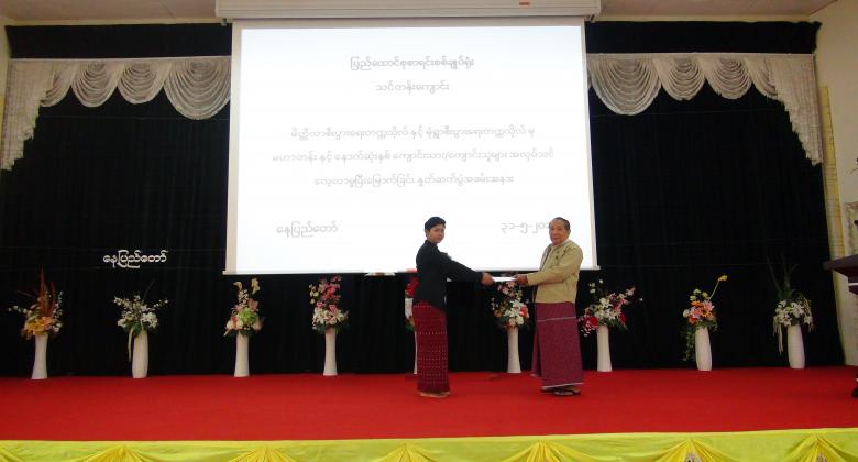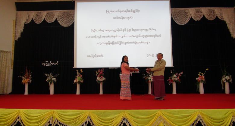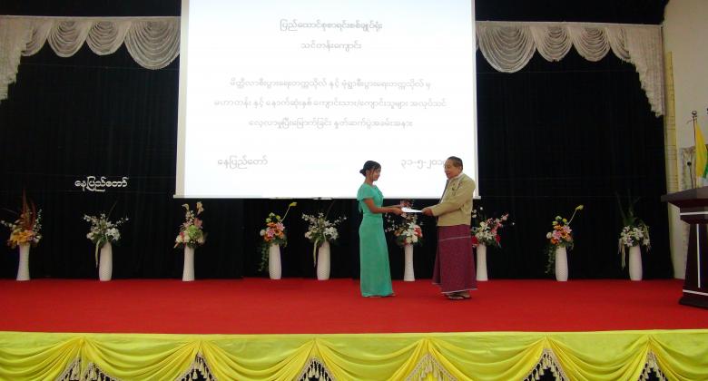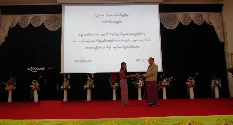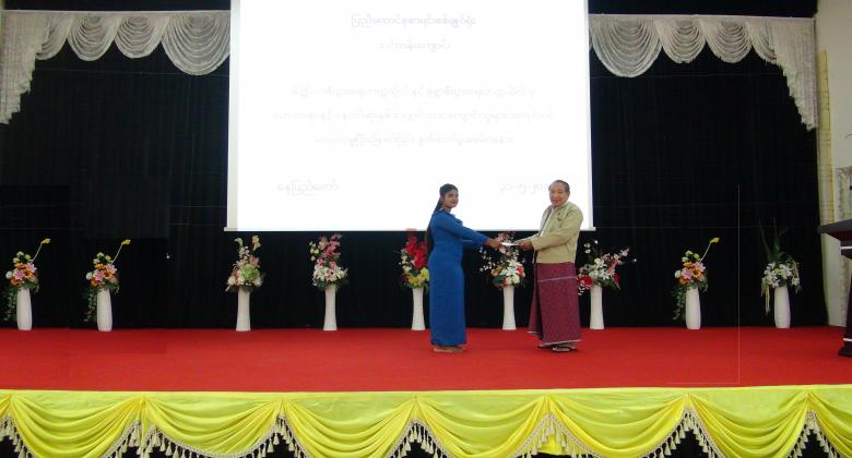 ၄။      ပြည်ထောင်စုစာရင်းစစ်ချုပ်မှ အလုပ်သင်မောင်မယ်များအား အလုပ်သင်ပြီးမြောက်ကြောင်း အသိမှတ်ပြုလက်မှတ် ချီးမြှင့်ပေးအပ်ခဲ့ပြီး အခမ်းအနားကို မွန်းလွဲ ( ၂  : ၀၀ ) နာရီတွင် ရုပ်သိမ်းခဲ့ပါသည်။