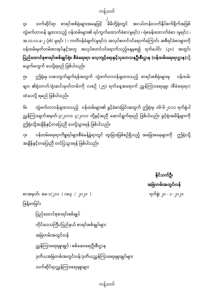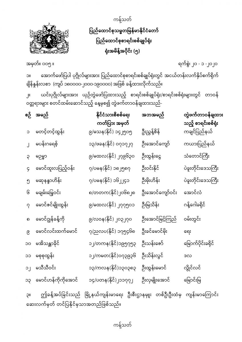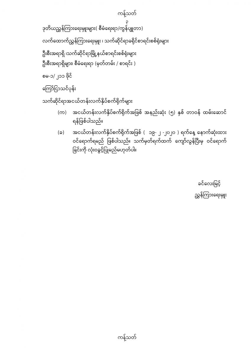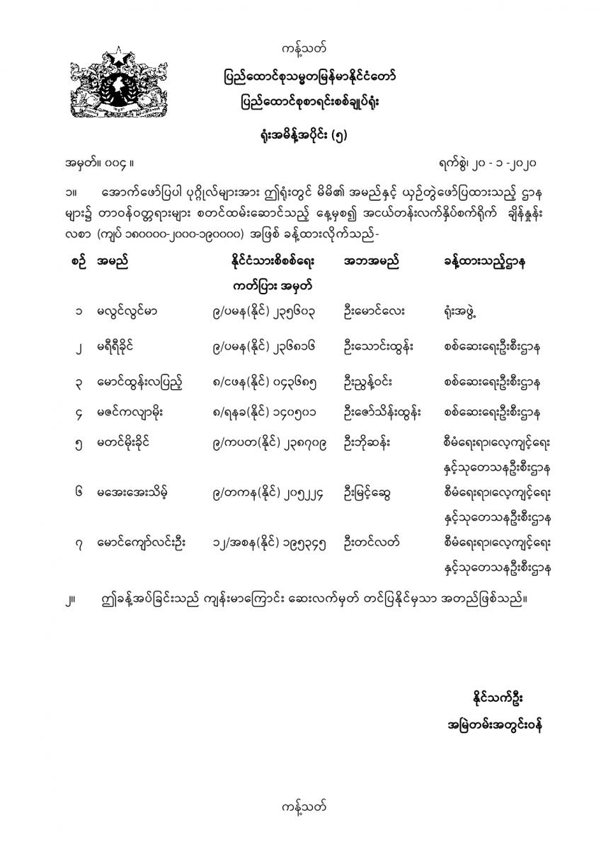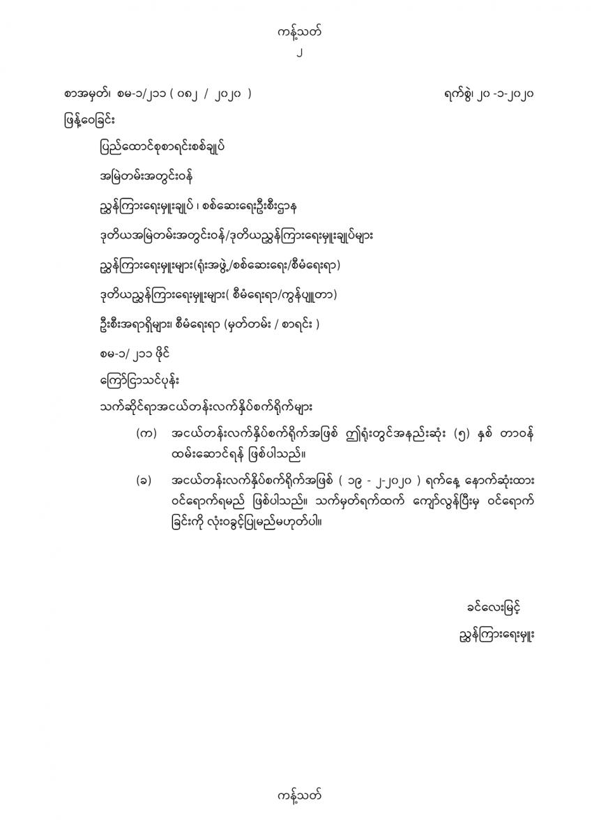 ပြည်ထောင်စုစာရင်းစစ်ချုပ်ရုံး၊ တိုင်းဒေသကြီး/ ပြည်နယ်စာရင်းစစ်ချုပ်ရုံးများနှင့် ဒေသစာရင်းစစ်ရုံးများတွင် အငယ်တန်းလက်နှိပ်စက်ရိုက် ချိန်နှုန်းလစာ (ကျပ် ၁၈၀၀၀၀-၂၀၀၀-၁၉၀၀၀၀) ရာထူးအတွက် ဝန်ထမ်းသစ်များခန့်ထားခြင်း