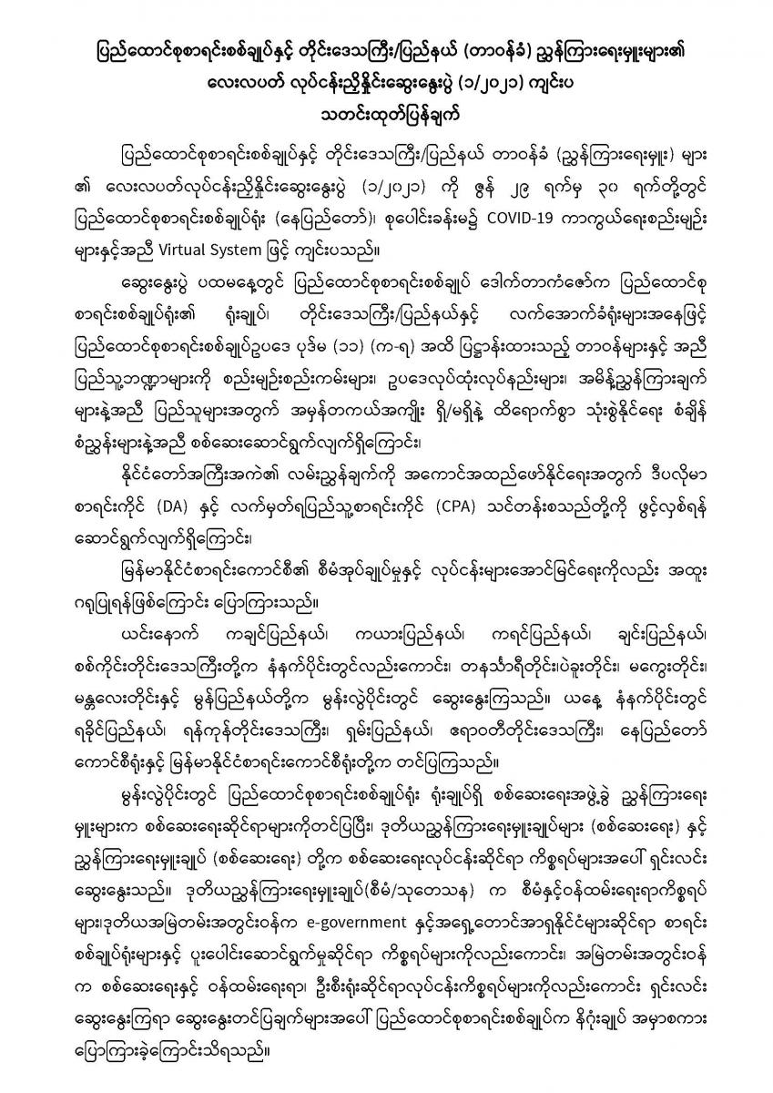 ၂၉-၆-၂၀၂၁ ရက်နေ့နှင့် ၃၀-၆-၂၀၂၁ ရက်နေ့တွင် ပြည်ထောင်စုစာရင်းစစ်ချုပ်နှင့် တိုင်းဒေသကြီး/ပြည်နယ် (တာဝန်ခံ) ညွှန်ကြားရေးမှူးများ၏ လေးလပတ် လုပ်ငန်းညှိနှိုင်းဆွေးနွေးပွဲ (၁/၂၀၂၁) ကျင်းပခြင်း