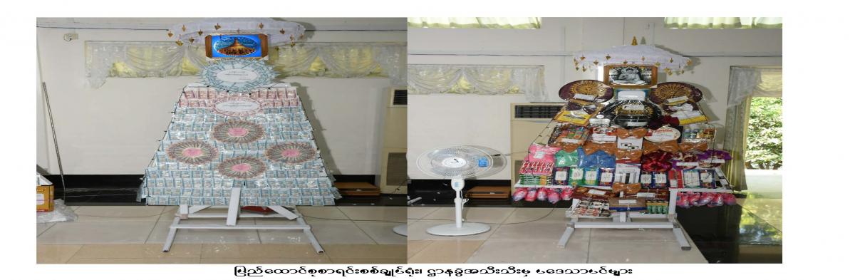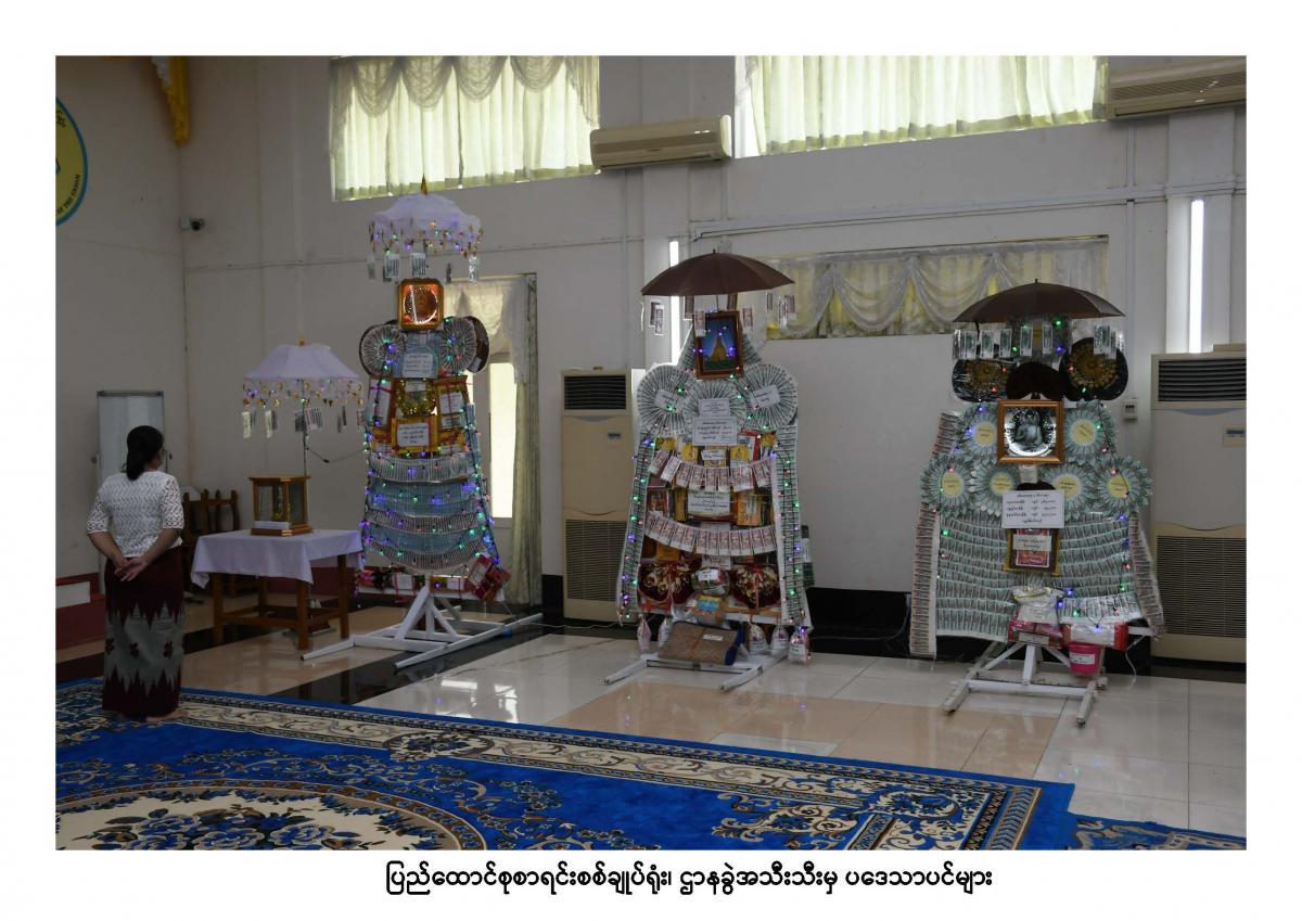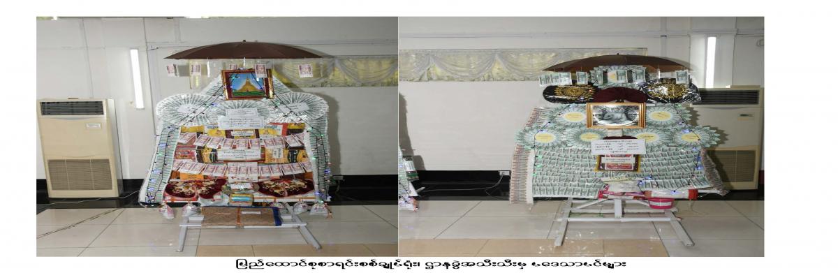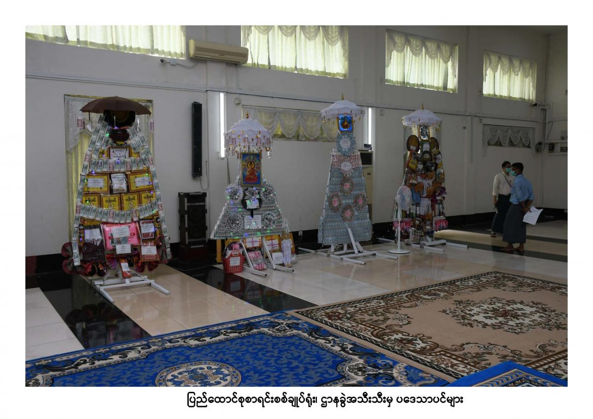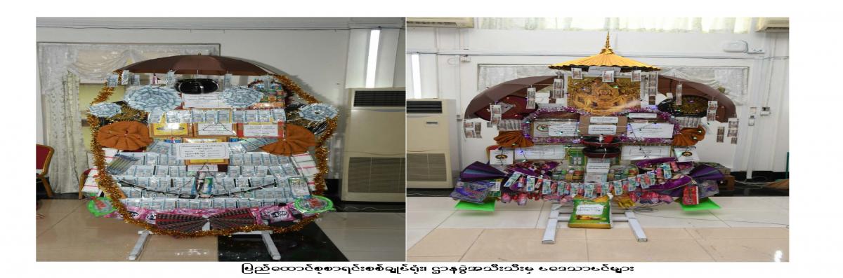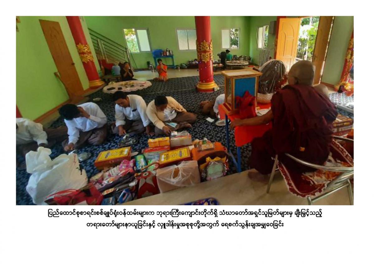 The 14th Collective Maha Kathina donation ceremony of the Office of the Auditor General of the Union was held at the Bayargyi and the Yadanar Bhumithara monasteries at 09:00 am on 12 November, 2021. Maha Kathina robe and offertories, kyats 4,811,200 in cash and worth kyats 3,756,800 in kind, totaling amount kyats 8,568,000 were offered to the monks. Venerable Sayadaws recited the Paritta Suttas, preached a sermon and merits were shared for the donations made.