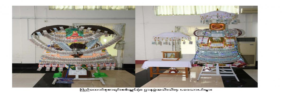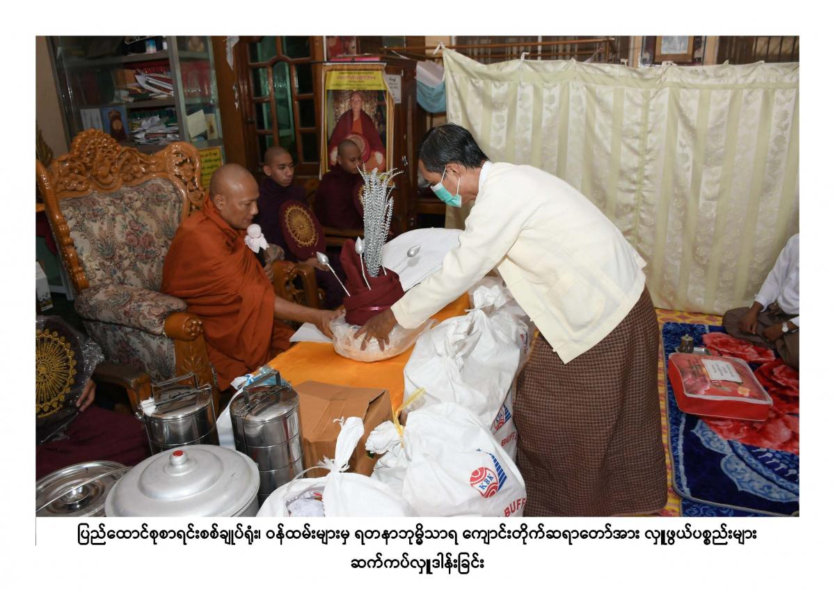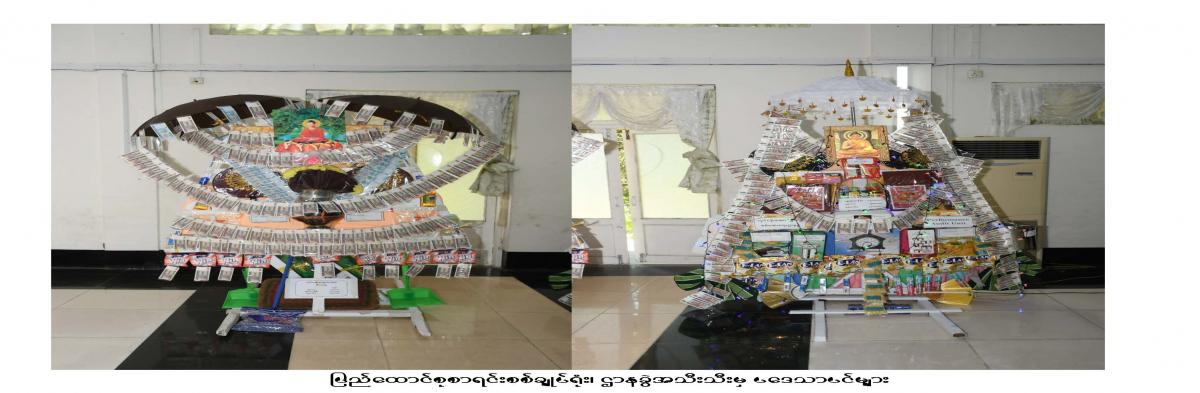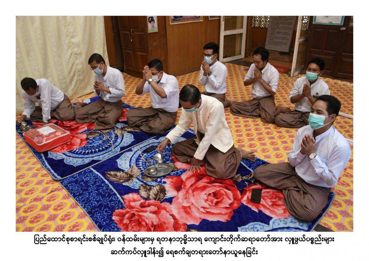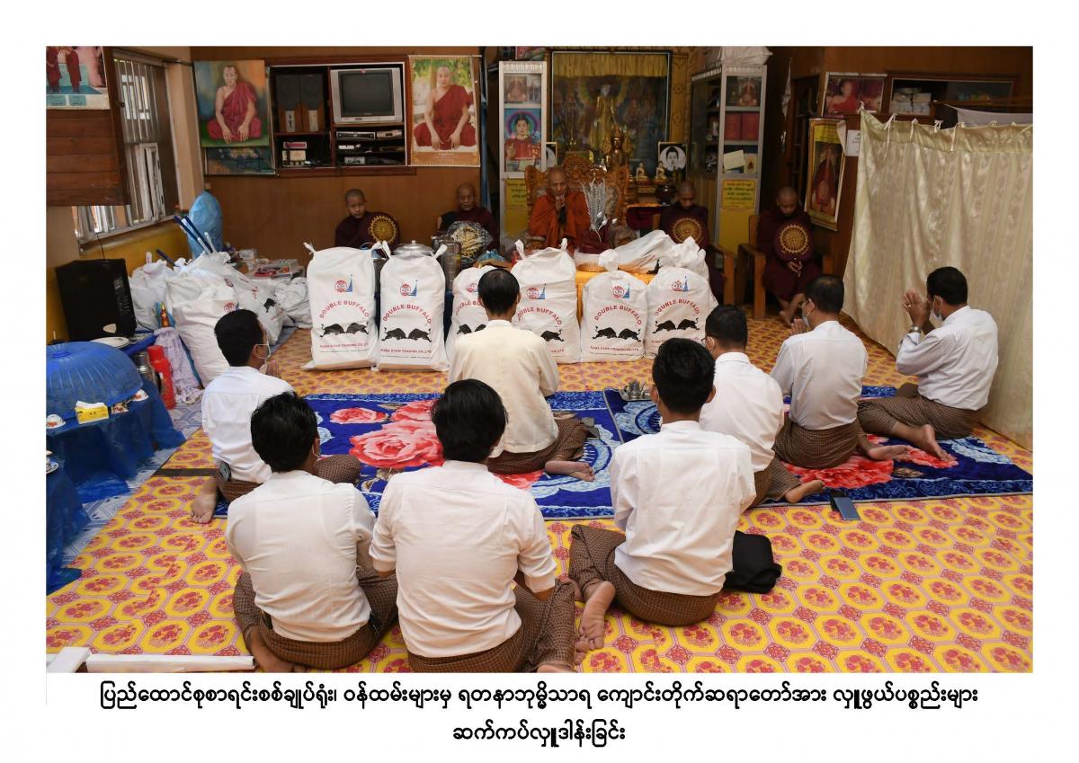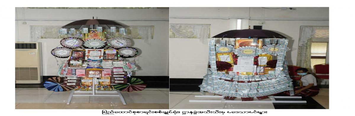 The 14th Collective Maha Kathina donation ceremony of the Office of the Auditor General of the Union was held at the Bayargyi and the Yadanar Bhumithara monasteries at 09:00 am on 12 November, 2021. Maha Kathina robe and offertories, kyats 4,811,200 in cash and worth kyats 3,756,800 in kind, totaling amount kyats 8,568,000 were offered to the monks. Venerable Sayadaws recited the Paritta Suttas, preached a sermon and merits were shared for the donations made.