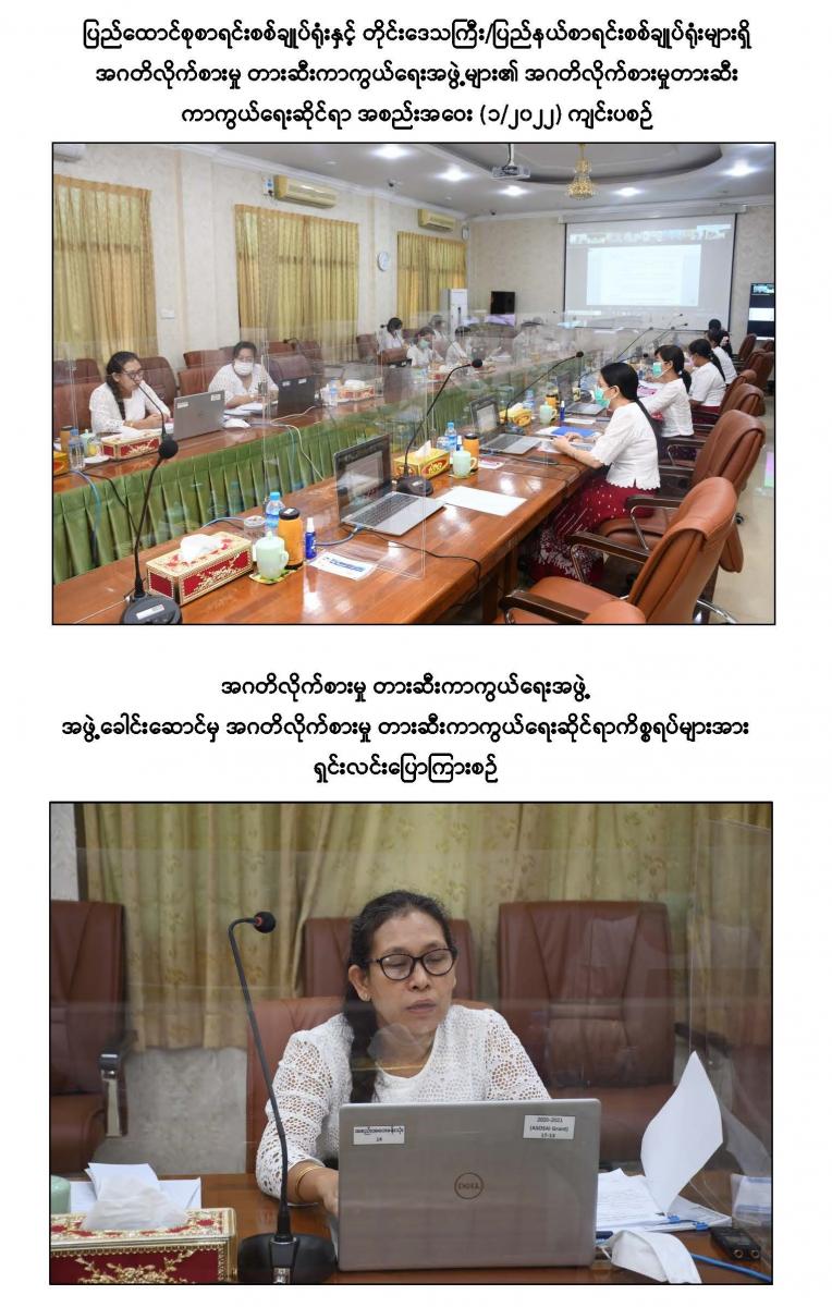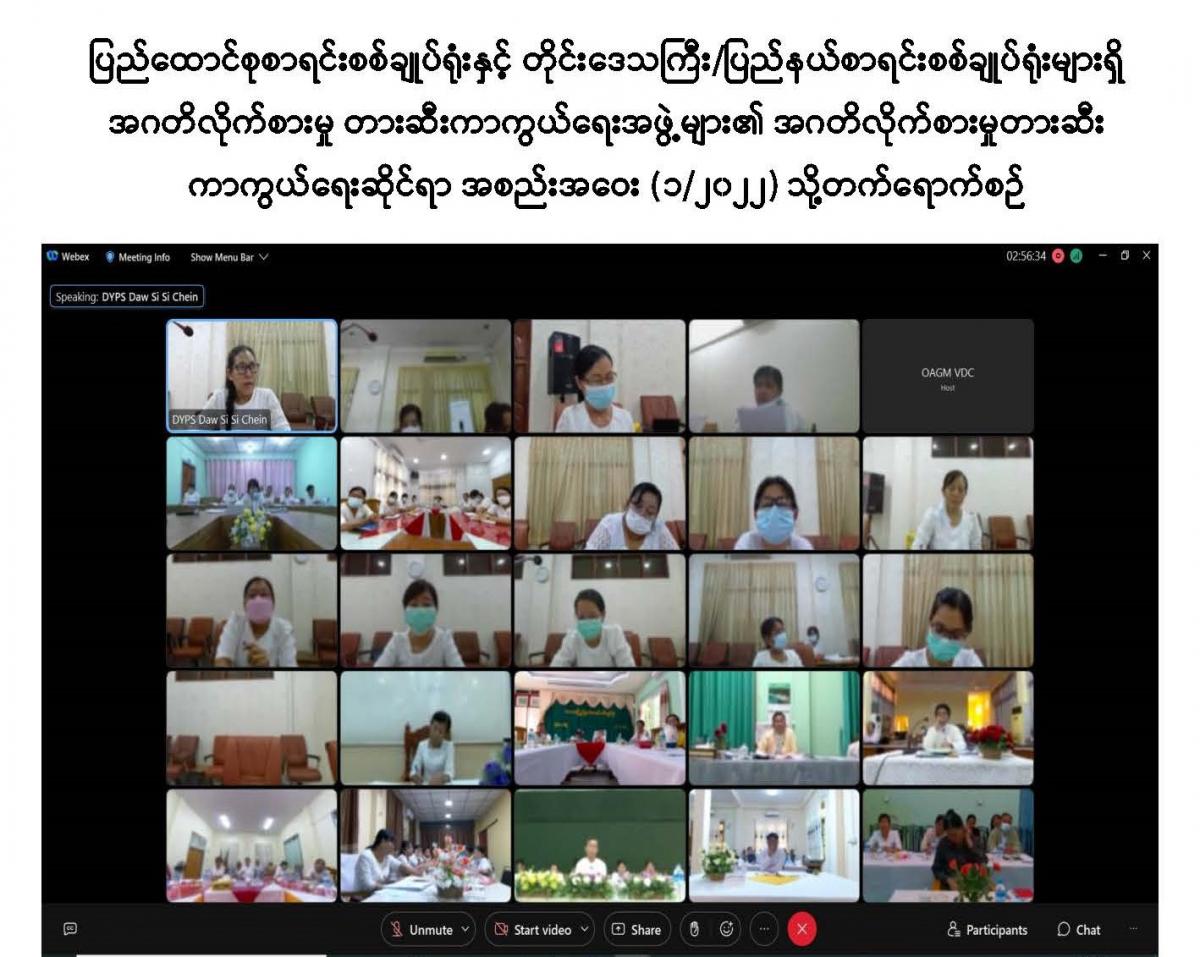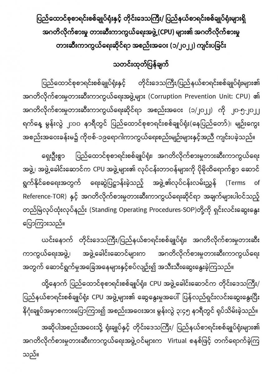 ၂၀-၅-၂၀၂၂ ရက်နေ့တွင် ပြည်ထောင်စုစာရင်းစစ်ချုပ်ရုံးနှင့် တိုင်းဒေသကြီး/ ပြည်နယ်စာရင်းစစ်ချုပ်ရုံးများရှိ အဂတိလိုက်စားမှု တားဆီးကာကွယ်ရေးအဖွဲ့(CPU) များ၏ အဂတိလိုက်စားမှု တားဆီးကာကွယ်ရေးဆိုင်ရာ အစည်းအဝေး (၁/၂၀၂၂) ကျင်းပခြင်း