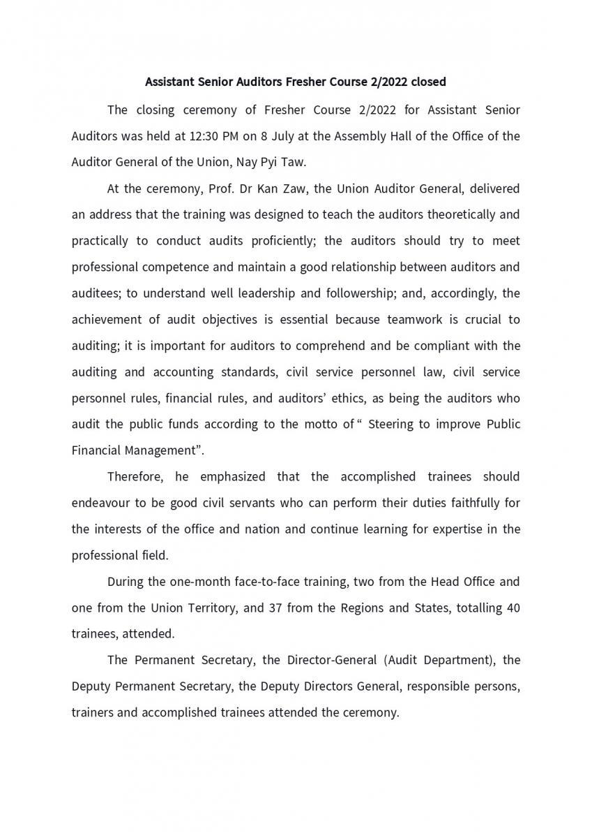 Assistant Senior Auditors Fresher Course 2/2022 closed