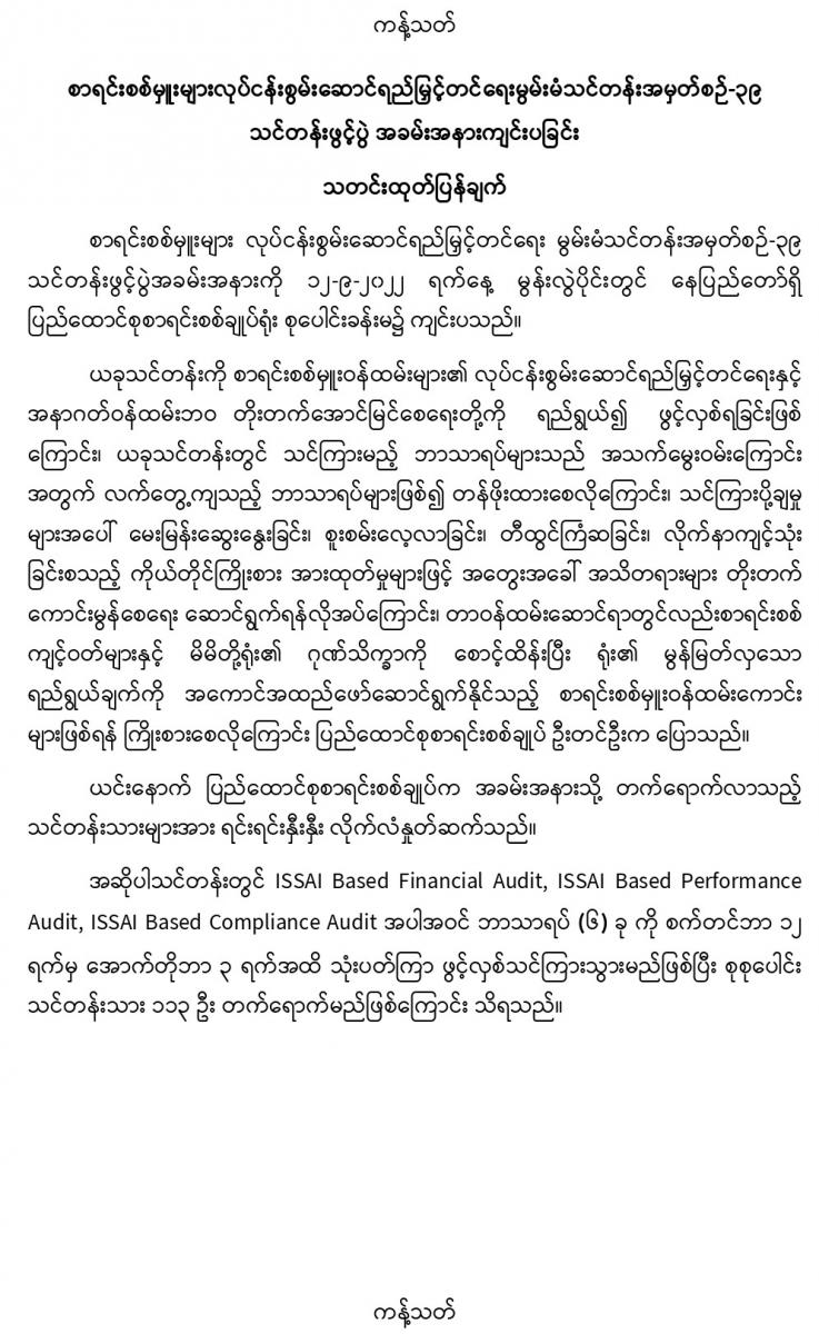၁၂-၉-၂၀၂၂ ရက်နေ့တွင် စာရင်းစစ်မှူးများလုပ်ငန်းစွမ်းဆောင်ရည်မြှင့်တင်ရေးမွမ်းမံသင်တန်းအမှတ်စဉ်-၃၉ သင်တန်းဖွင့်ပွဲ အခမ်းအနားကျင်းပခြင်း