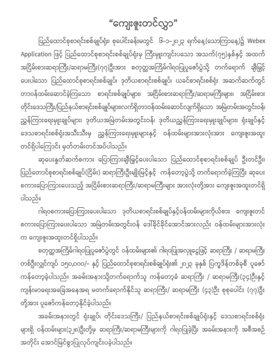 "ဂုဏ်ပြုထိုက်သော စာရင်းစစ်ချုပ်ရုံး အငြိမ်းစားဆရာသမားများအား ၆-၁-၂၀၂၃ ရက်နေ့တွင် စတုတ္ထအကြိမ်ပူဇော်ကန်တော့ပွဲ ကျင်းပပြုလုပ်ခြင်းအတွက် အလှူငွေကောက်ခံရရှိမှု၊ ပြန်လည်လှူဒါန်းကန်တော့မှုနှင့် ငွေလက်ကျန်ကျန်ရှိမှု" နှင့် "ကျေးဇူးတင်လွှာ"