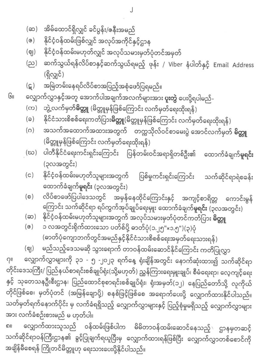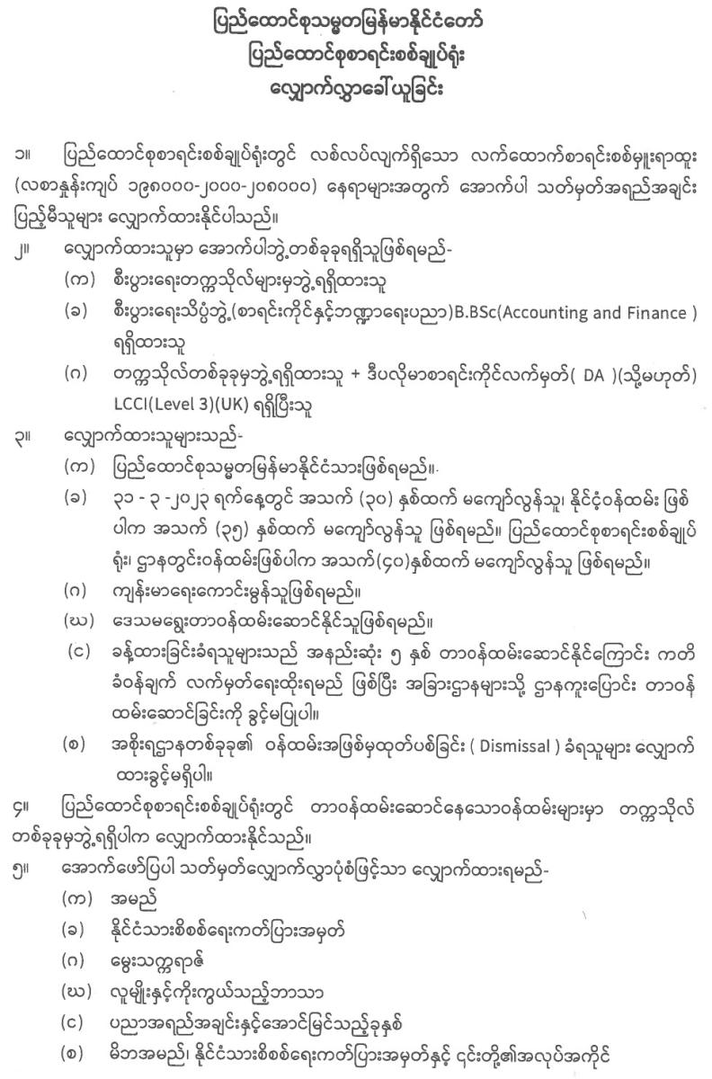 ပြည်ထောင်စုစာရင်းစစ်ချုပ်ရုံးတွင် လစ်လပ်လျက်ရှိသော လက်ထောက်စာရင်းစစ်မှူးရာထူး (လစာနှုန်းကျပ် ၁၉၈၀၀၀-၂၀၀၀-၂၀၈၀၀၀) နေရာများအတွက် လျှောက်လွှာခေါ်ယူခြင်း
