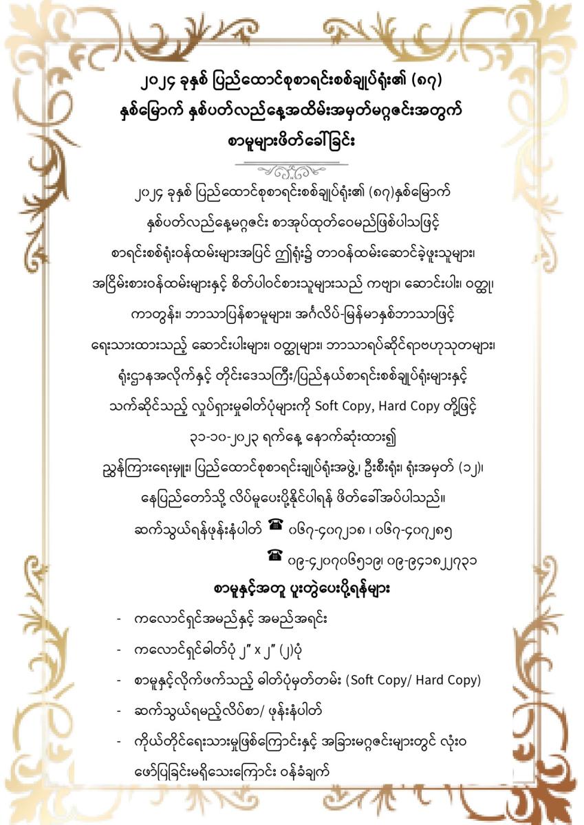 ၂၀၂၄ ခုနှစ် ပြည်ထောင်စုစာရင်းစစ်ချုပ်ရုံး၏ (၈၇)နှစ်မြောက် နှစ်ပတ်လည်နေ့အထိမ်းအမှတ်မဂ္ဂဇင်းအတွက် စာမူများဖိတ်ခေါ်ခြင်း