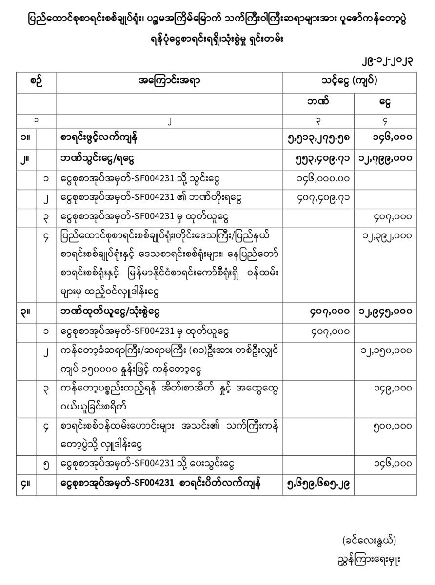 ၂၉-၁၂-၂၀၂၃ ရက်နေ့ ပြည်ထောင်စုစာရင်းစစ်ချုပ်ရုံး၊ ပဉ္စမအကြိမ်မြောက် သက်ကြီးဝါကြီးဆရာများအား ပူဇော်ကန်တော့ပွဲ ရန်ပုံငွေစာရင်းရရှိ၊သုံးစွဲမှု ရှင်းတမ်း