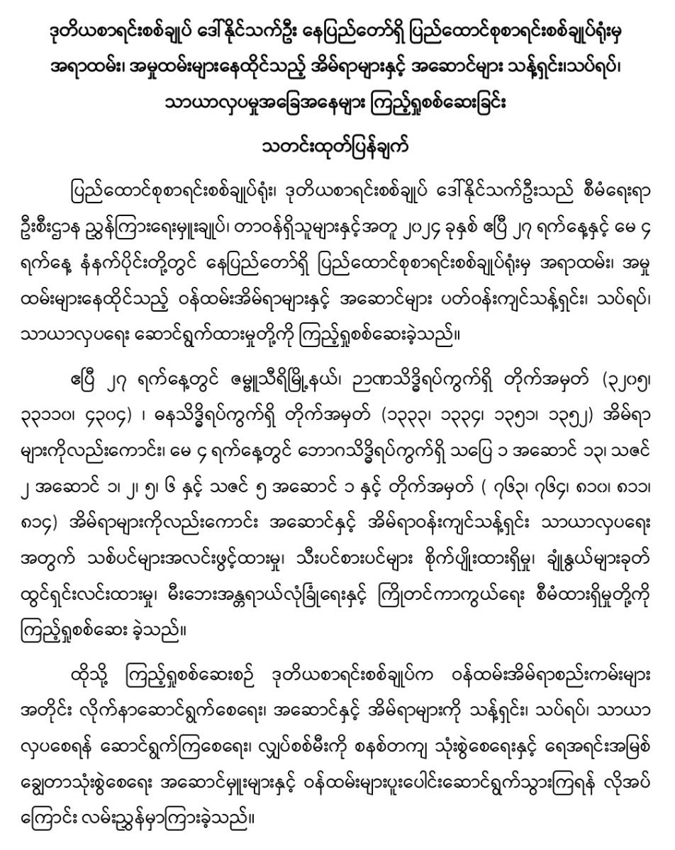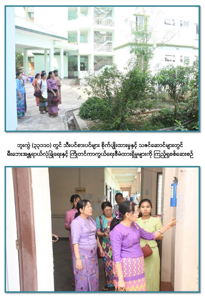 ၄-၅-၂၀၂၄ ရက်နေ့တွင် ဒုတိယစာရင်းစစ်ချုပ် ဒေါ်နိုင်သက်ဦး နေပြည်တော်ရှိ ပြည်ထောင်စုစာရင်းစစ်ချုပ်ရုံးမှ အရာထမ်း၊ အမှုထမ်းများနေထိုင်သည့် အိမ်ရာများနှင့် အဆောင်များ သန့်ရှင်း၊သပ်ရပ်၊ သာယာလှပမှုအခြေအနေများ ကြည့်ရှုစစ်ဆေးခြင်း