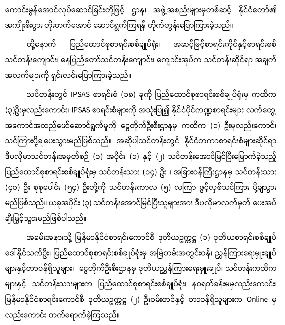 ၂၄-၆-၂၀၂၄ ရက်နေ့တွင် နိုင်ငံပိုင်ကဏ္ဍအတွက် နိုင်ငံတကာစာရင်းစံများဆိုင်ရာ ဒီပလိုမာသင်တန်း အမှတ်စဉ် (၁) အပိုင်း(၃) သင်တန်းဖွင့်ပွဲ အခမ်းအနားကျင်းပခြင်း