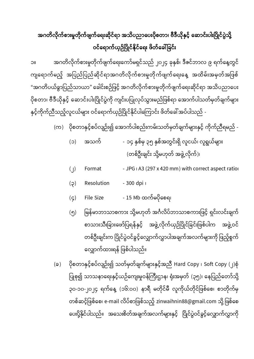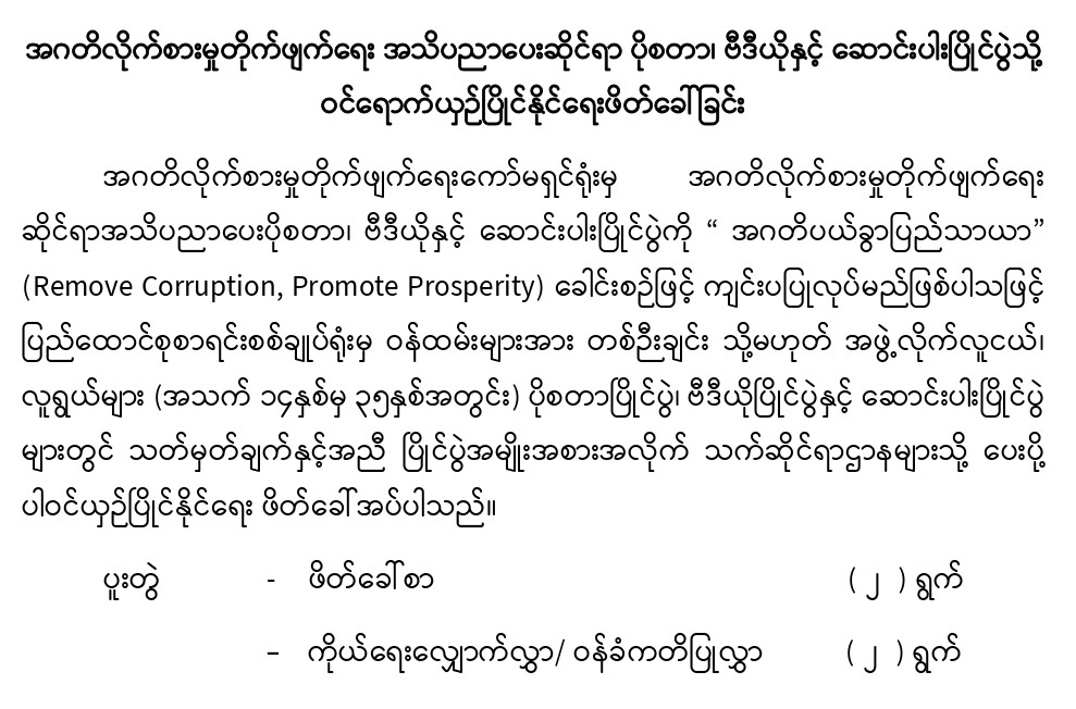 အဂတိလိုက်စားမှုတိုက်ဖျက်ရေး အသိပညာပေးဆိုင်ရာ ပိုစတာ၊ ဗီဒီယိုနှင့် ဆောင်းပါးပြိုင်ပွဲသို့ ဝင်ရောက်ယှဉ်ပြိုင်နိုင်ရေးဖိတ်ခေါ်ခြင်း