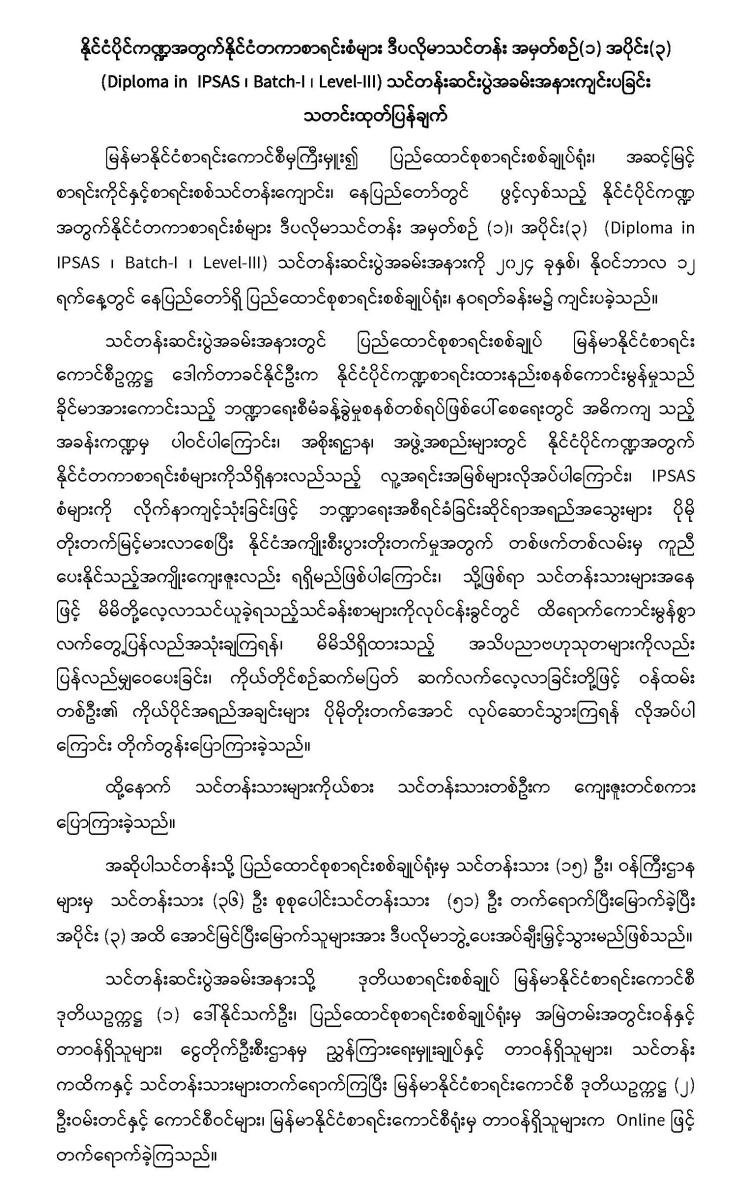 နိုင်ငံပိုင်ကဏ္ဍအတွက်နိုင်ငံတကာစာရင်းစံများ ဒီပလိုမာသင်တန်း အမှတ်စဉ်(၁) အပိုင်း(၃) (Diploma in IPSAS ၊ Batch-I ၊ Level-III) သင်တန်းဆင်းပွဲအခမ်းအနားကျင်းပခြင်း
