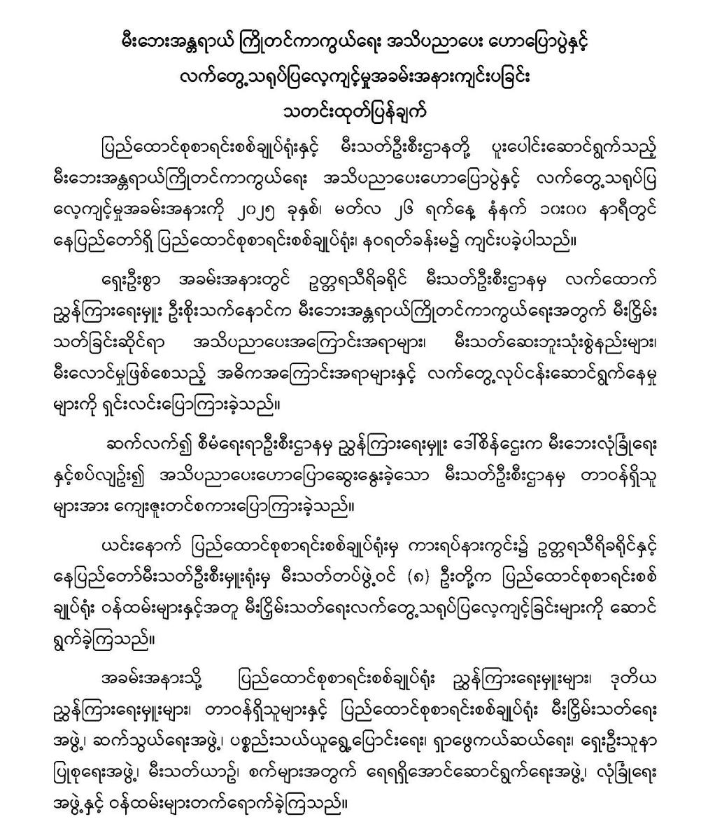 မီးဘေးအန္တရာယ် ကြိုတင်ကာကွယ်ရေး အသိပညာပေး ဟောပြောပွဲနှင့် လက်တွေ့သရုပ်ပြလေ့ကျင့်မှုအခမ်းအနားကျင်းပခြင်း သတင်းထုတ်ပြန်ချက်