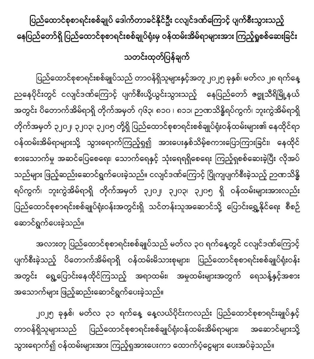 ပြည်ထောင်စုစာရင်းစစ်ချုပ် ဒေါက်တာခင်နိုင်ဦး ငလျင်ဒဏ်ကြောင့် ပျက်စီးသွားသည့် နေပြည်တော်ရှိ ပြည်ထောင်စုစာရင်းစစ်ချုပ်ရုံးမှ ဝန်ထမ်းအိမ်ရာများအား ကြည့်ရှုစစ်ဆေးခြင်း သတင်းထုတ်ပြန်ချက်