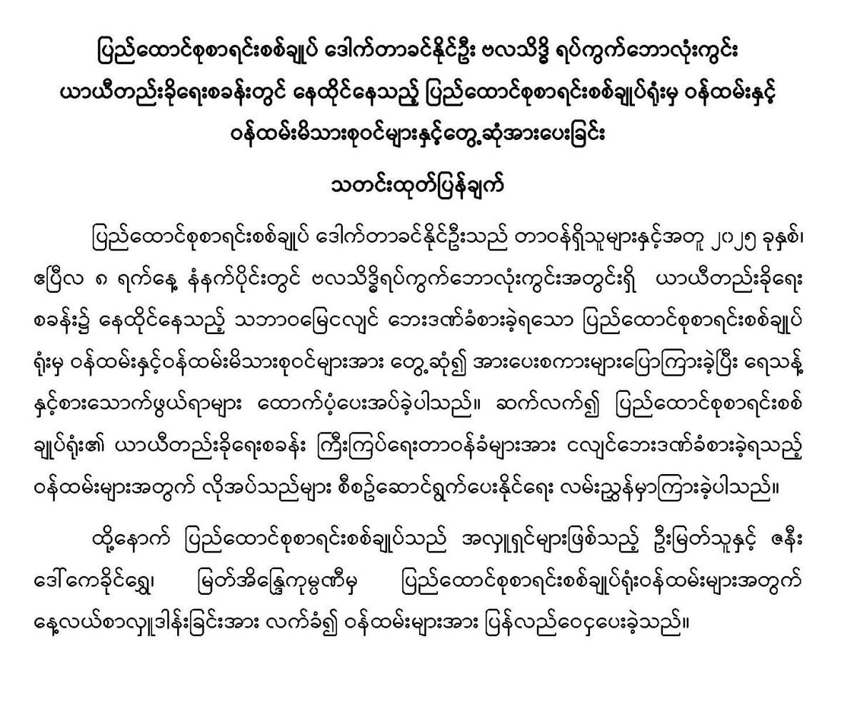 ပြည်ထောင်စုစာရင်းစစ်ချုပ် ဒေါက်တာခင်နိုင်ဦး ဗလသိဒ္ဓိ ရပ်ကွက်ဘောလုံးကွင်း ယာယီတည်းခိုရေးစခန်းတွင် နေထိုင်နေသည့် ပြည်ထောင်စုစာရင်းစစ်ချုပ်ရုံးမှ ဝန်ထမ်းနှင့် ဝန်ထမ်းမိသားစုဝင်များနှင့်တွေ့ဆုံအားပေးခြင်း