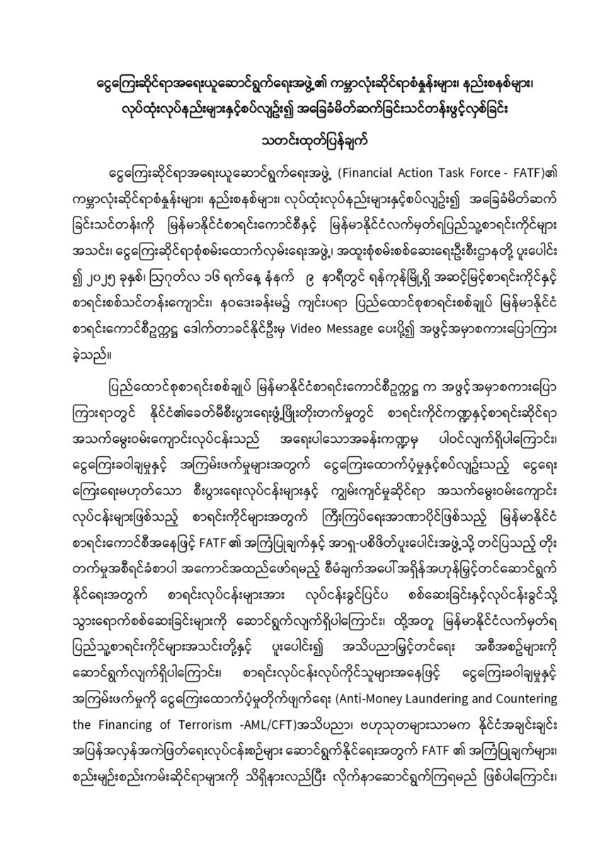 ငွေကြေးဆိုင်ရာအရေးယူဆောင်ရွက်ရေးအဖွဲ့၏ ကမ္ဘာလုံးဆိုင်ရာစံနှုန်းများ၊ နည်းစနစ်များ၊ လုပ်ထုံးလုပ်နည်းများနှင့်စပ်လျဥ်း၍ အခြေခံမိတ်ဆက်ခြင်းသင်တန်းဖွင့်လှစ်ခြင်း